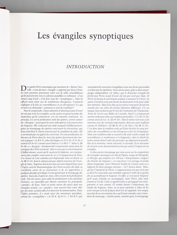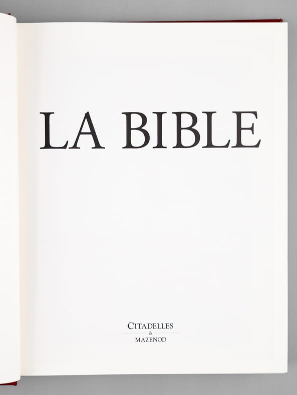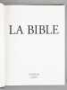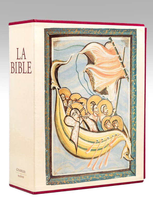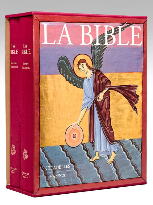 Citadelles & Mazenod Paris 1998 IMPORTANTE BIBLE en 2 volumes fort in-4 carré ( 310 X 240 mm ) de 1096 et 449 pages, pleine peau acajou, dos à nerfs orné d'un fleuron doré, macaron doré et ornementation à froid sur les plats, toutes tranches dorées, étui bordé. Superbe publication tirée sur papier Pheonix Impérial demi-mat naturel, la gravure des abondantes illustrations en couleurs hors-texte est de Graphic Service, Milan, la composition est de Richard Medioni, Paris. Le motif de la couverture est inspiré de la reliure d'un sacramentaire du IXe siècle conservé à la bibliothèque Nationale de France. EXEMPLAIRE DU TIRAGE DE LUXE autirage limité, pleine peau chèvre grain naturel a été reliée dans la meilleure tradition artisanale par les maîtres relieurs des ateliers Ardant à Limoges. Cet exemplaire porte le numéro 31. Très bel exemplaire à l'état de neuf.