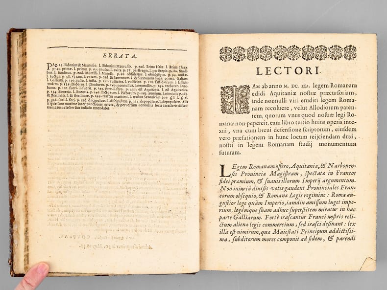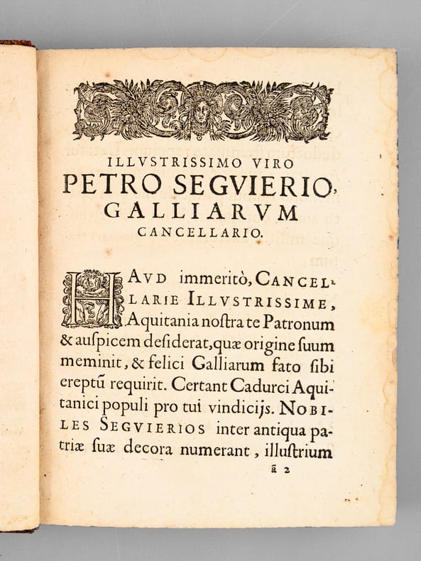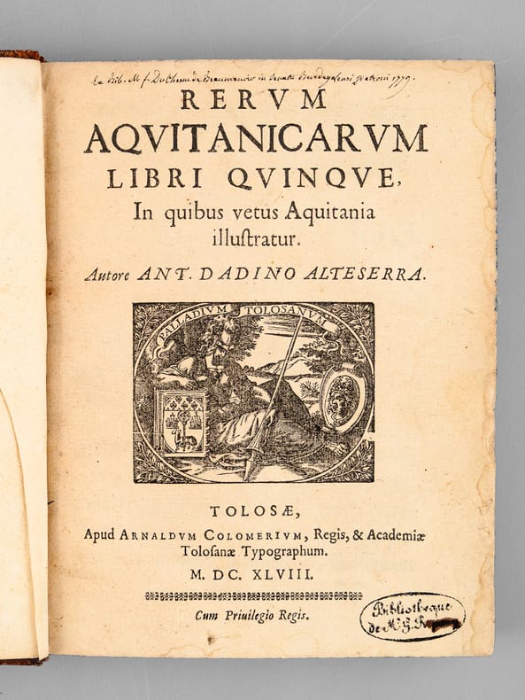 Juriste et historien toulousain né à Cahors, Antoine Dadin de Hauteserre (1602-1682) fut nommé professeur régent à l'Université de Toulouse avec l'appui du chancelier Pierre Séguie,r en cette même année 1648 où il publia le présent ouvrage, consacré à l'histoire ancienne de l'Aquitaine. L'ouvrage est dédié à l'illustre chancelier Séguier. Hauteserre "fait observer qu'il n' pu s'aider d'aucune histoire spéciale, celle de Jean Besly étant trop incomplète pour lui avoir été de quelque utilité. A la fin de son Proemium, Auteserre invoque Saint Martial et place son livre sous la protection du grand apôtre de l'Aquitaine". Dans son étude relative à la correspondance inédite de l'auteur, Philippe Tamizey de Larroque écrit encore à propos de l'ouvrage : "Qu'il me suffise de dire qu'encore à l'heure présente, sur l'histoire, sur la géographie, même sur la philologie, on trouve dans ces pages un grand nombre d'indications précieuses. Les citations s'y pressent exactes non moins que complètes ; les lumineux rapprochements s'y multiplient ; les idées ingénieuses y abondent ; en un mot, la sagacité y rivalise partout avec l'érudition, et, comme comme l'ont reconnu tous les critiques, depuis le P. Lelong jusqu'à M. Rodière, c'est là véritablement un livre fait de main de maître". Etat très satisfaisant (usures en coiffes et mors een tête, anciennes mouill., fortes surtout dans le cahier central, bon état par ailleurs, ex-libris ms : "Ex Bib. M. F. Du Chesne de Beaumanoir in Senatu Burdigalensi patroni 1779". L'avocat Marie François Duchesne de Beaumanoir (1756-1830) fut avocat et subdélégué général de la Guyenne.