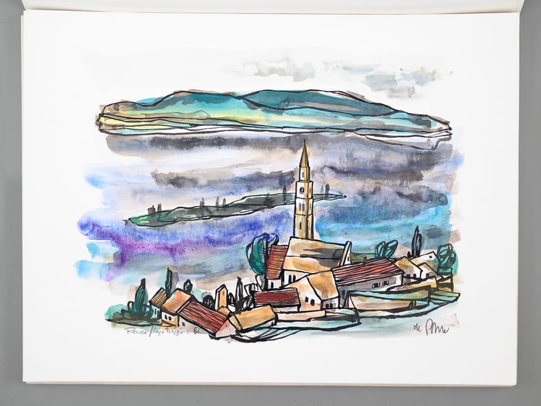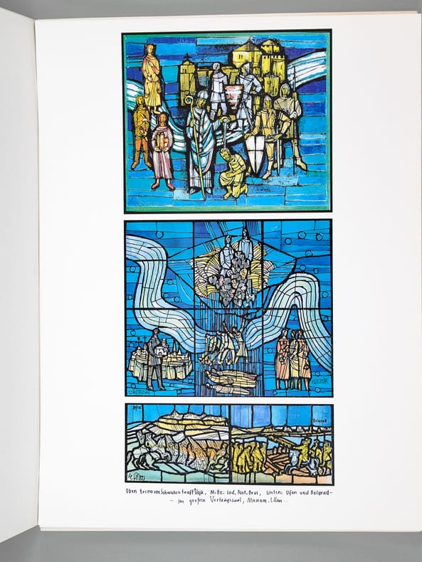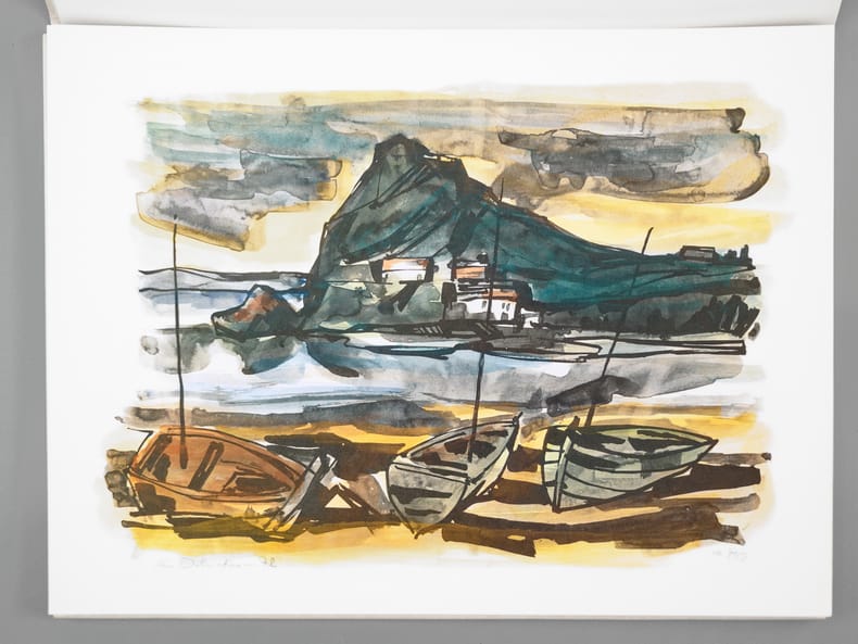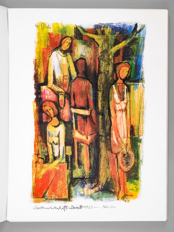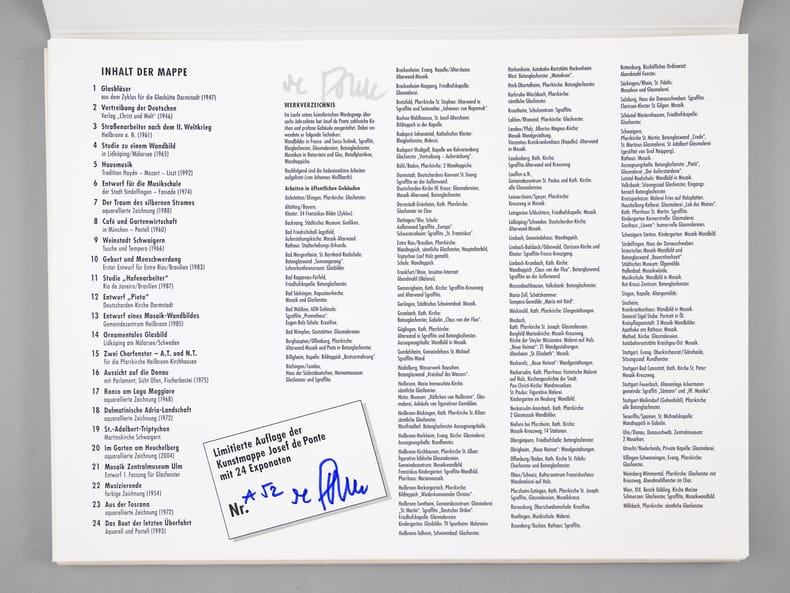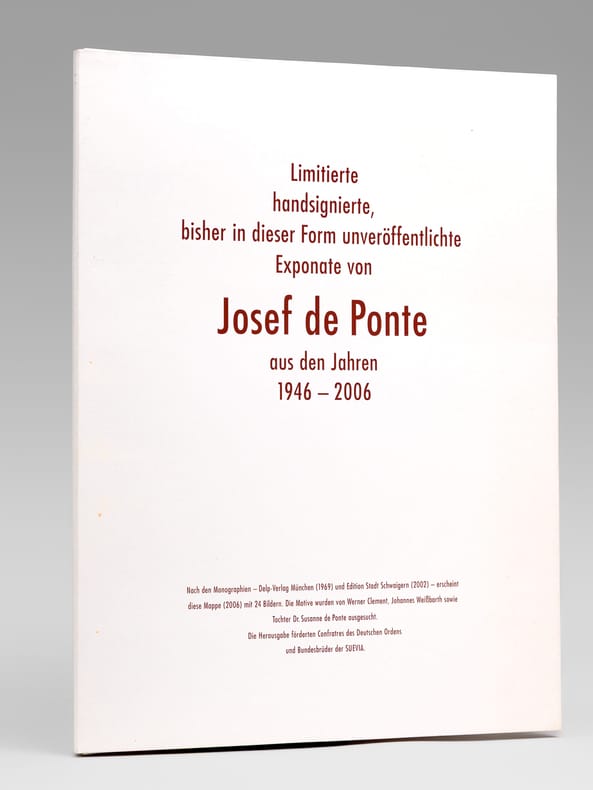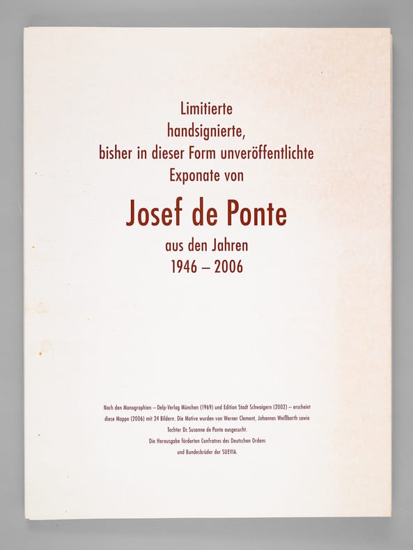 Aus dem Fundus von vielen hundert noch nicht veröffentlichten Arbeiten Josef de Pontes wählte eine Jury – Werner Clement, Dr. Susanne de Ponte und Johannes Weißbarth – 24 Exponate für die Veröffentlichung aus. So entstand die vorliegende Kunstmappe als eine Dokumentation der großen Vielfalt der von Josef de Pote verwendeten Themen und Techniken. Daneben zeigt die Sequenz der Arbeiten die künstlerische Entwicklung seines Schaffens, die auch aus seinen übrigen mehr als 12 Bildbänden und Mappen erhellt. Josef de Ponte (1922-2006) wurde am 5. Oktober 1922 in Budakeszi in Ungarn geboren; besuchte von 1939-1944 die Hochschule der Bildenden Künste in Budapest und Wien. Nach der Vertreibung aus seiner geliebten Heimat fand der Künstler zunächst in Heilbronn, dann in Schwaigern eine neue Heimat: Josef de Pontes künstlerisches Werk zeichnet sich aus durch eine enorme Vielfalt des Schaffens, die von der Lithographie und Kunstliteratur bis zur Kunst am Bau reicht. From the vast collection of hundreds of unpublished works by Josef de Ponte, a jury—Werner Clement, Dr. Susanne de Ponte, and Johannes Weißbarth—selected 24 pieces for publication. This portfolio thus became a documentation of the great diversity of themes and techniques employed by Josef de Ponte. Furthermore, the sequence of works illustrates the artistic development of his oeuvre, which is also evident in his more than 12 other illustrated books and portfolios. Josef de Ponte (1922–2006) was born on October 5, 1922, in Budakeszi, Hungary; from 1939 to 1944, he attended the Academy of Fine Arts in Budapest and Vienna. After being expelled from his beloved homeland, the artist initially found a new home in Heilbronn, and later in Schwaigern. Josef de Ponte's artistic work is characterized by an enormous diversity, ranging from lithography and art literature to public art.