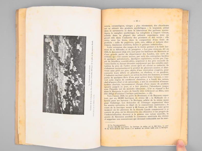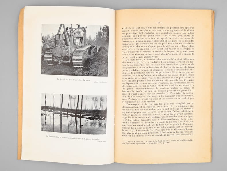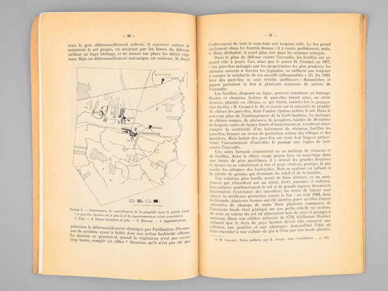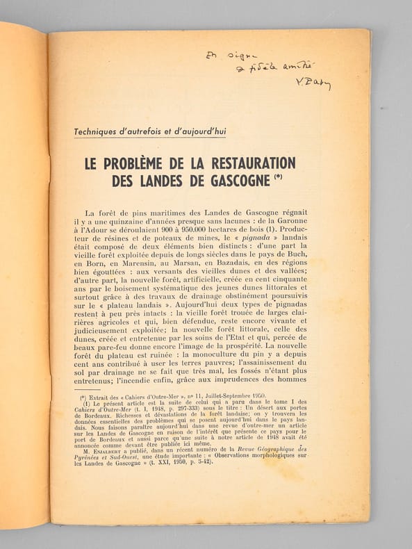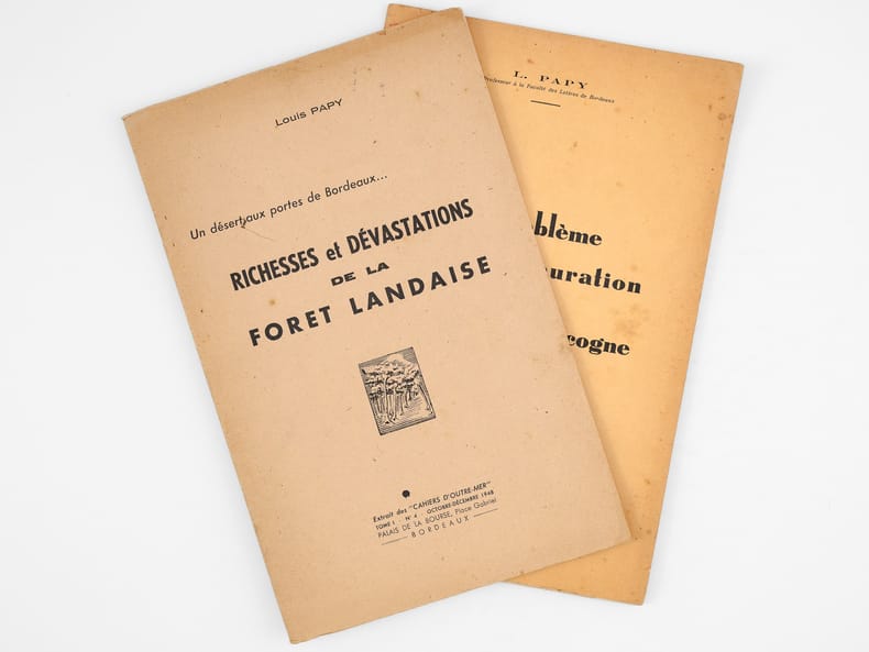 Bon état pour ces deux tirés-à-part des importants articles de Louis Papy, le premier prémonitoire et le second rédigé au lendemain des terribles désastres de 1949 : "en 1949, 130.000 hectares ont été parcourus par le feu dont 53.000 hectares de pins : le record de 1943 a été battu [ ... ] L'épisode le plus tragique de l'été 1949 fut l'incendie qui ravagea les landes girondines dans la seconde quinzaine d'août. [ ... ] La journée du 20 août fut tragique : la grande ville se trouva plongée dès 16 heures dans une nuit lourde d'angoisse, tandis que l'horizon embrasé de lueurs rougeoyantes évoquait une vision d'Apocalypse. [ ... ] Le vent soufflait aux approches de l'incendie avec une violence inouïe ; un vent né des appels d'air déterminés par le feu et non d'un cyclone issu du golfe de Gascogne, comme certains l'ont affirmé. Au centre des tourbillons, il fut, chargé de sable, capable d'arracher les écorces d'arbres et de donner, en quelques secondes, au bois qu'il burina, un aspect éolien [ ... ] Quatre-vingt-deux hommes périrent ce jour là dont on retrouva les corps calcinés, certains affreusement recroquevillés dans les fossés [ ... ]