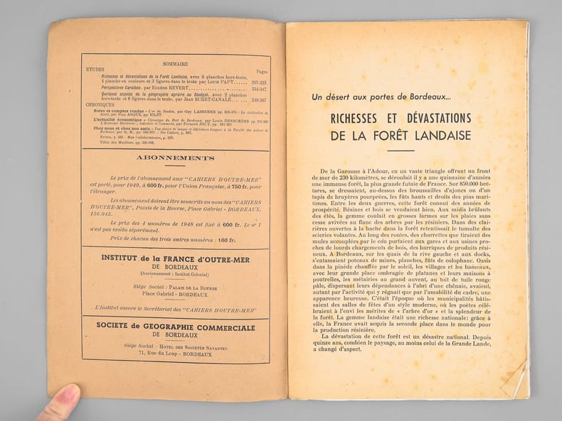 2 brochures in-8, Extrait des Cahiers d'Outre-mer, 1948, Institut de la France d'Outre-Mer, Bordeaux, 37 pp. et 1950, 48 pp.