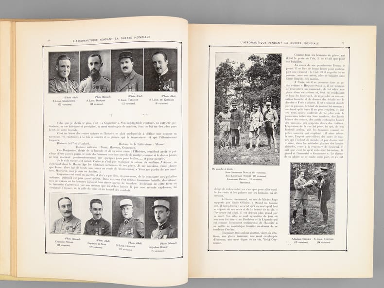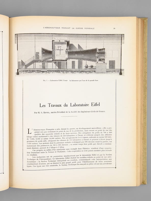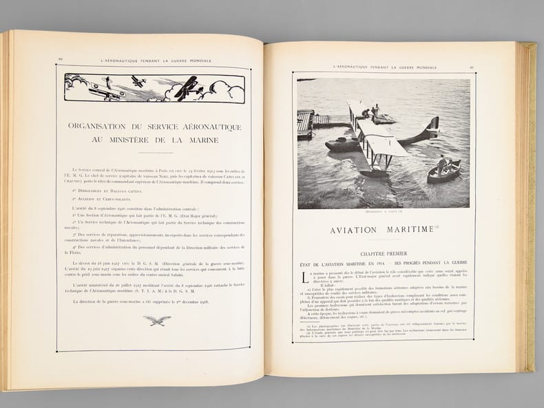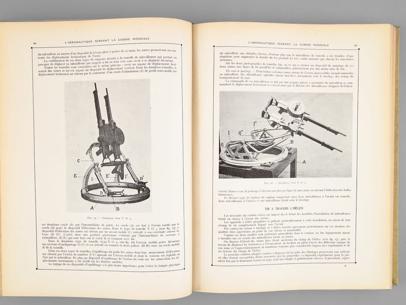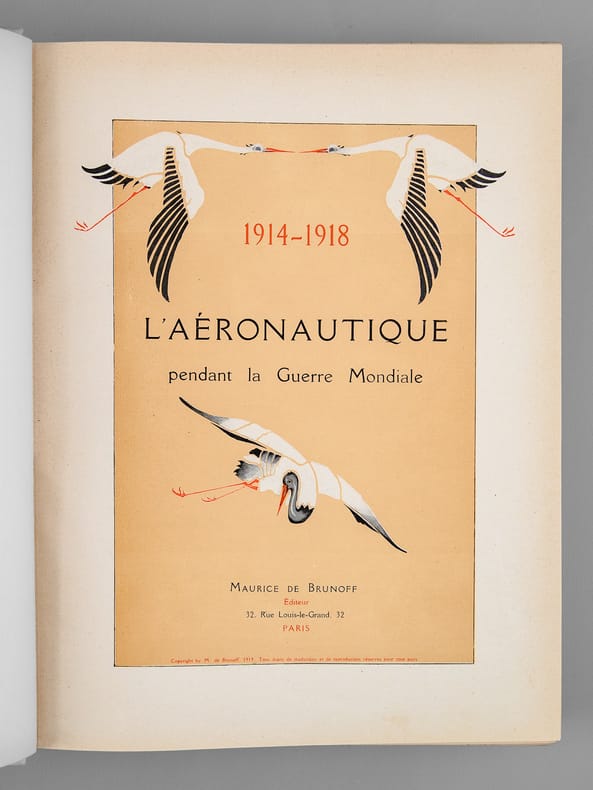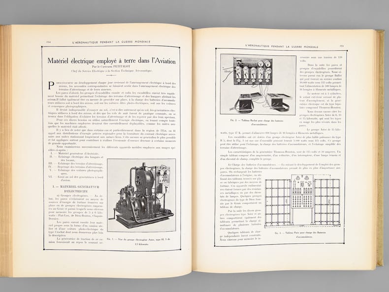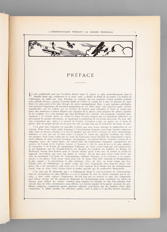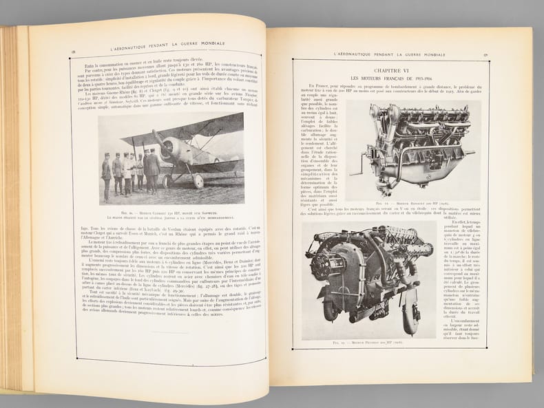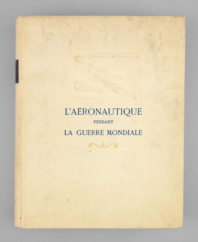 1 vol. grand in-4 cartonnage éditeur blanc estampé à froid, Maurice de Brunoff, Editeur, Paris, 1919, 735 pp. Contient : L'Effort gouvernemental, l'aéronautique militaire (L'aviateur, Nos As, Aviation de chasse et bombardement de jour, L'aviation française de reconnaissance, Les Ecoles d'Aviation françaises pendant la guerre, Le Fonctionnemen de l'Ecole Supérieure d'Aéronautique pendant la guerre), Etude Spéciale de l'Avion de guerre (L'Evolution des Avions français pendant la guerre, Les Moters, L'armement, La Photographie aérienne, Les Hélices aériennes, La Construction de l'Hélice, Les Instruments de Bord, L'Electricité dans l'Aviation pendant la Guerre, Performance et Essais des Avions, Les Travaux du Laboratoire Eiffel), L'Aérostation (L'aérostation militaire pendant la guerre, Le Treuil, Les Câbles demanoeuvre des ballons captifs, Les Etoffes à Ballon, Les Parachutes, le Tender, L'Hydrogène, L'armement des compagnies d'aérostiers), l'Organisation militaire de la Production, l'aéronautique maritime, l'aéronautique civile, l'Effort industriel, Les Industries de l'Aéronautique (Avions : Bellanger Frères, Bernard, Borel, Blériot, Bréguet, Caudron, etc..., Moteurs : Anzani, Bignan, Chenard et Walker, Clerget-Blin et Cie, Delaunay-Belleville, Caffort-Frères, Darracq, etc...).