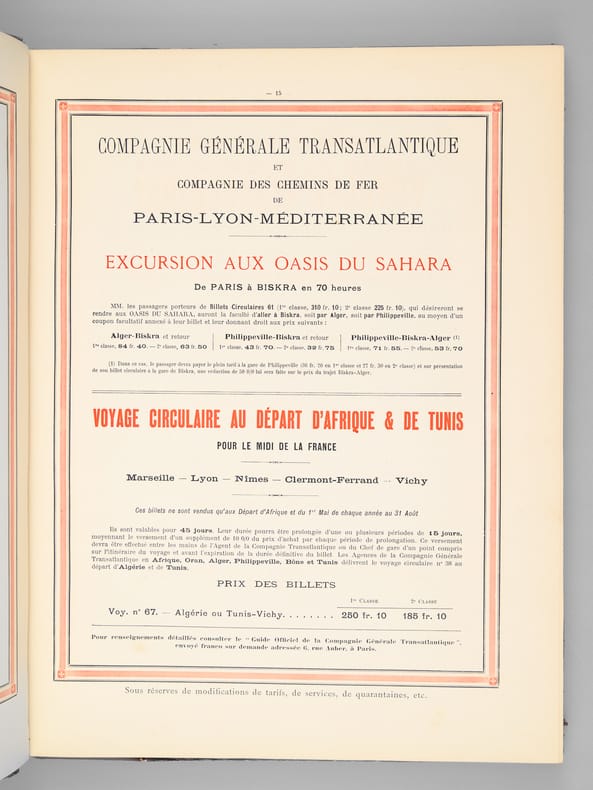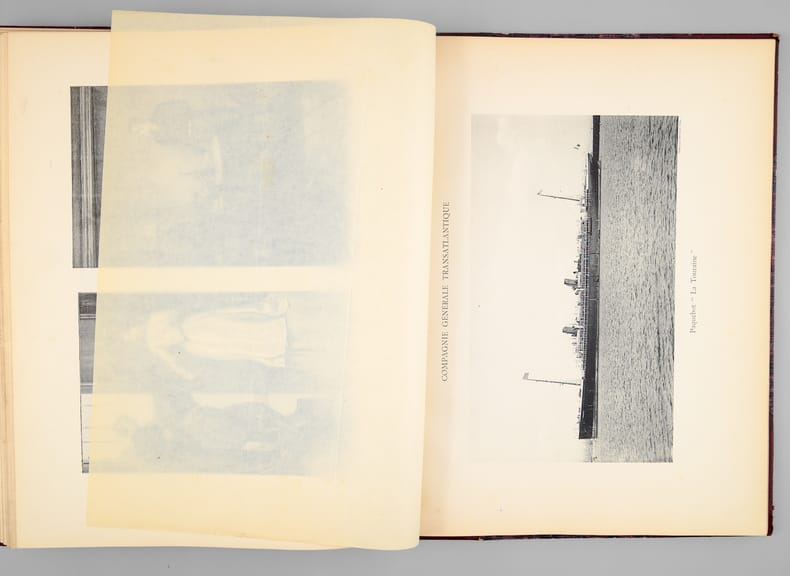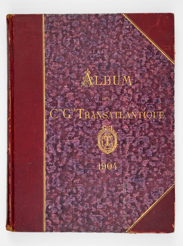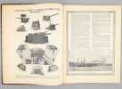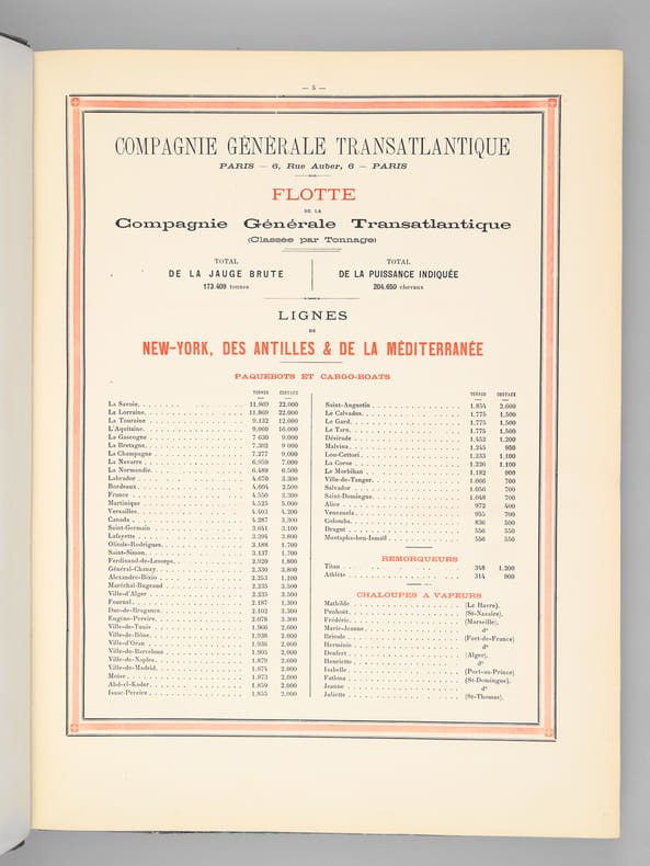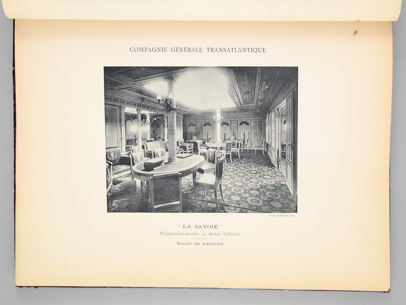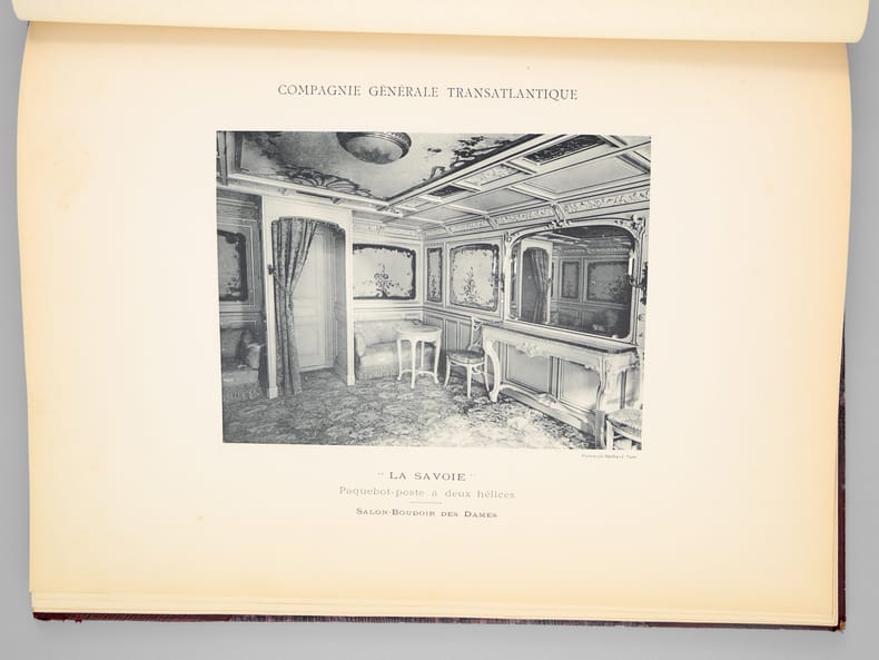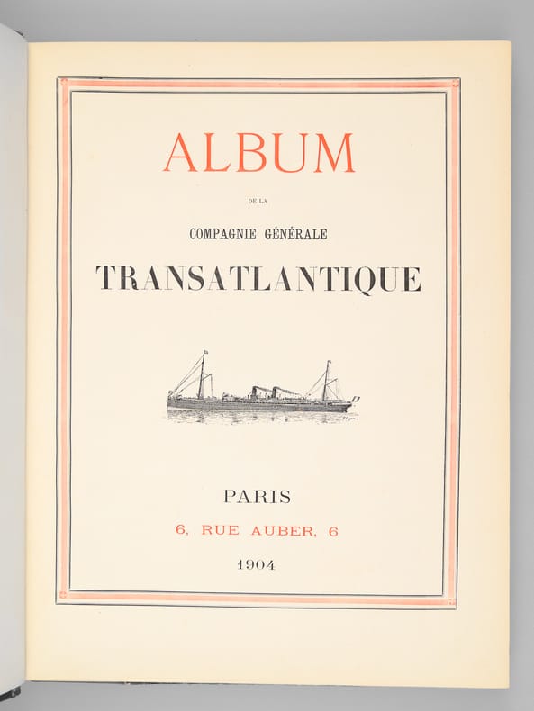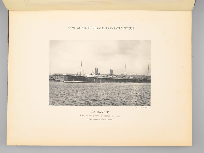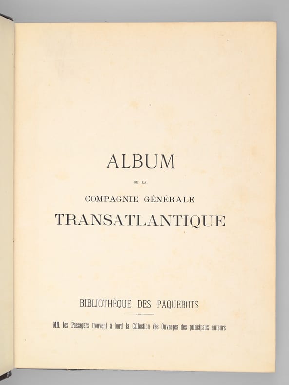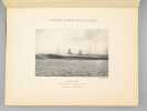 Très bel album proposant notamment le détail de la flotte de la Compagnie Générale Transatlantique (jauge brute de 173.409 tonnes), de nombreuses vues de "La Savoie", pauebot-poste à deux hélices de 11.884 tonnes, le détail des services postaux mais des différents voyages proposés par la CGT (voyages circulaires, excursions aux oasis du Sahara), de très belles publicités (Compagnes des Forges et aciéries de la marine & des chemins de fer, Th. Botiaux & Cie, Ingénieurs-Constructeurs, etc...), de nombreux extraits de journaux et revues illustrées, etc.... Bon état (reliure un peu frottée avec usures en coiffes, bon exemplaire par ailleurs)