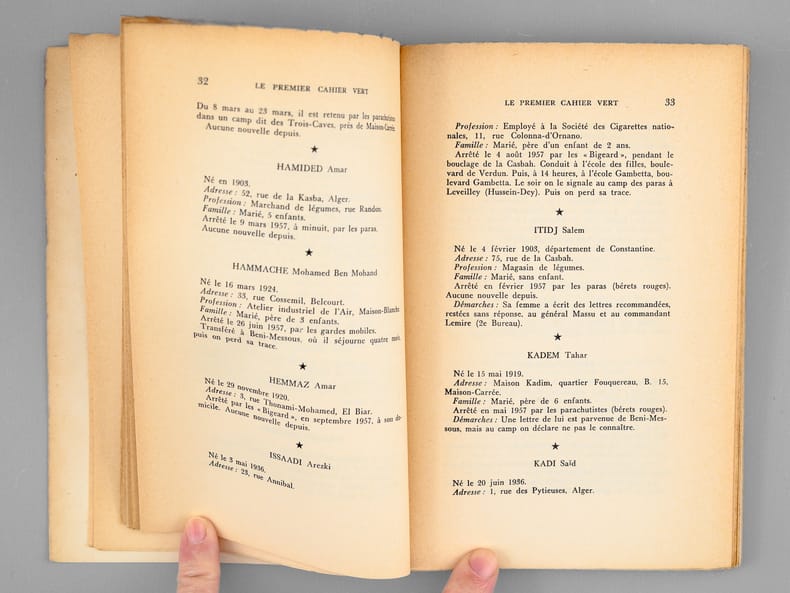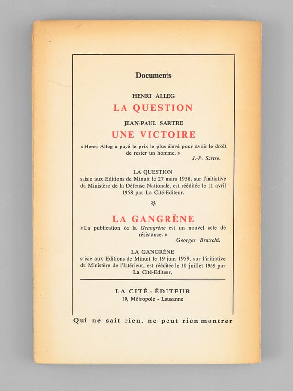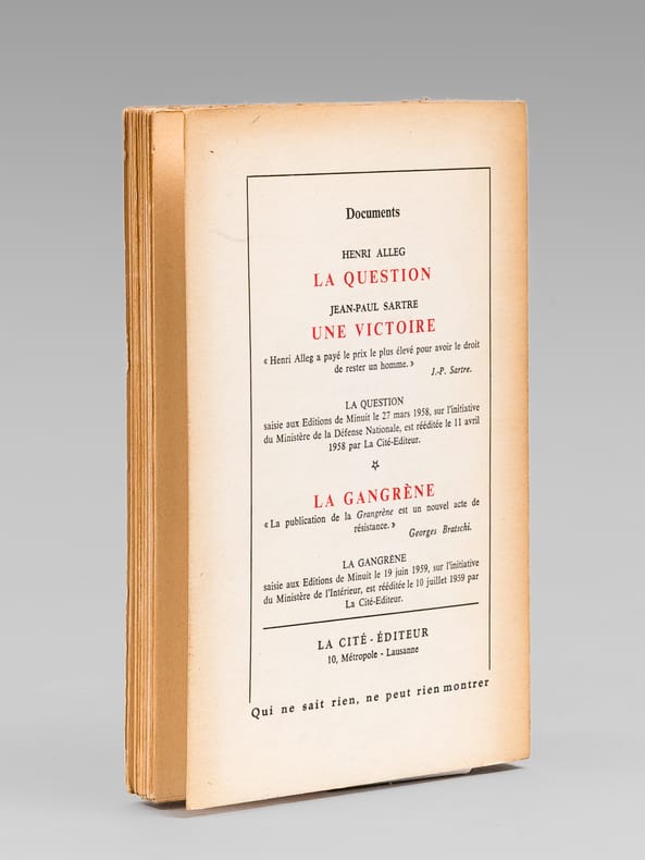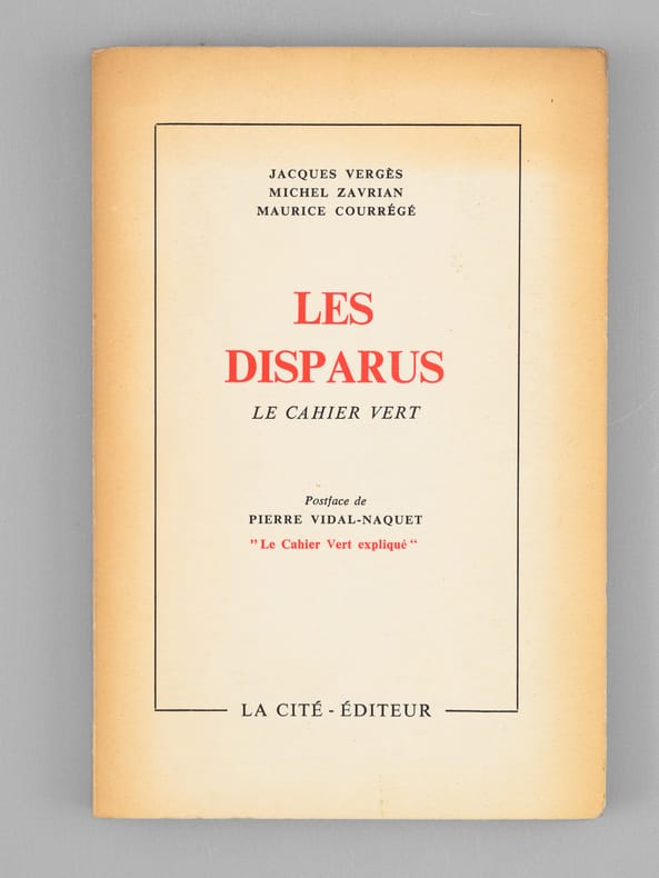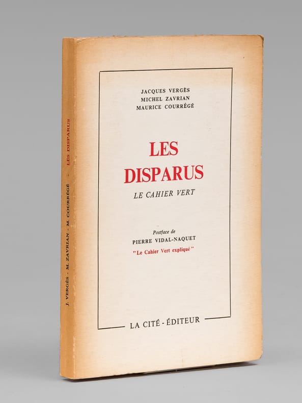 Postface de Pierre Vidal-Naquet, "Le Cahier vert expliqué", 1 vol. petit in-8 br., La Cité Editeur, Lausanne, 1959 (achevé d'imprimer le 10 décembre 1959), 116 pp., 16 hors texte