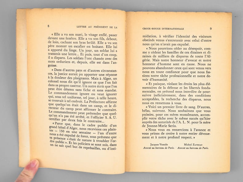 Bon exemplaire (non coupé). L'ouvrage comprend 175 plaintes pour disparition après enlèvement par les militaires, recueillies à Alger en août 1959 par les trois auteurs, avocats du FLN, dont le célèbre Jacques Vergès.
