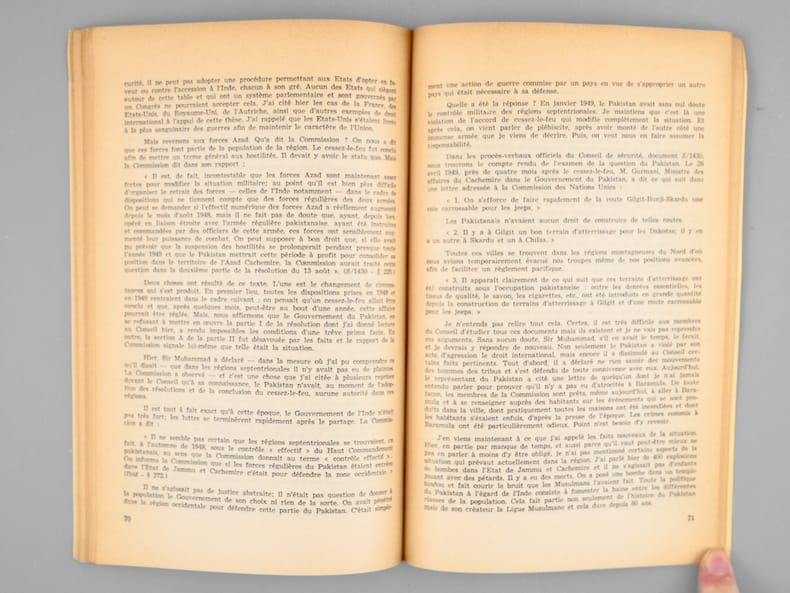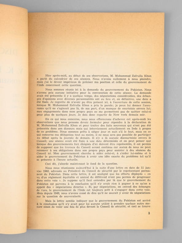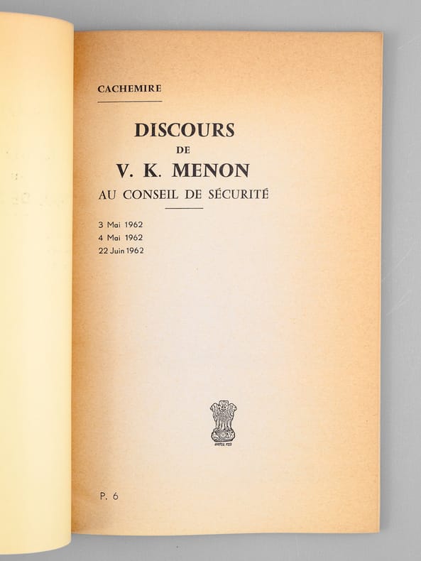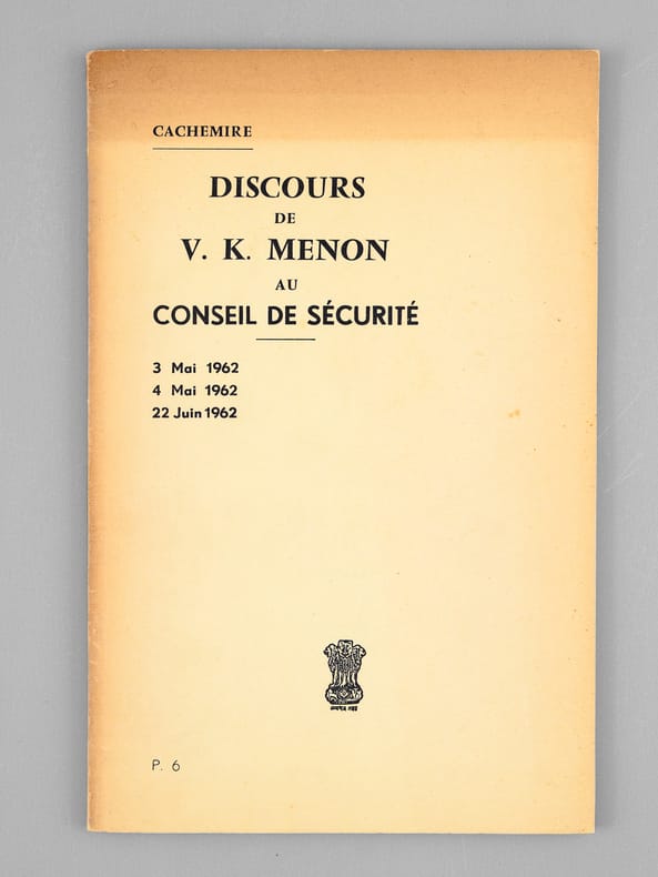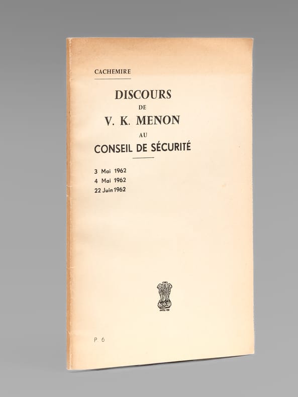 En 1957, V.K. Menon avait établi le record du plus long discours (8 heures) devant le Conseil de sécurité de l'ONU en défendant les droits de l'Inde sur le territoire contesté du Cachemire, gagnant ainsi une large popularité et le surnom de « Héros du Cachemire ». Les 3 discours de ce recueil précèdent la guerre sino-indienne de 1962, au terme de laquelle Menon donnera sa démission du Ministère de la Défense. Bon état