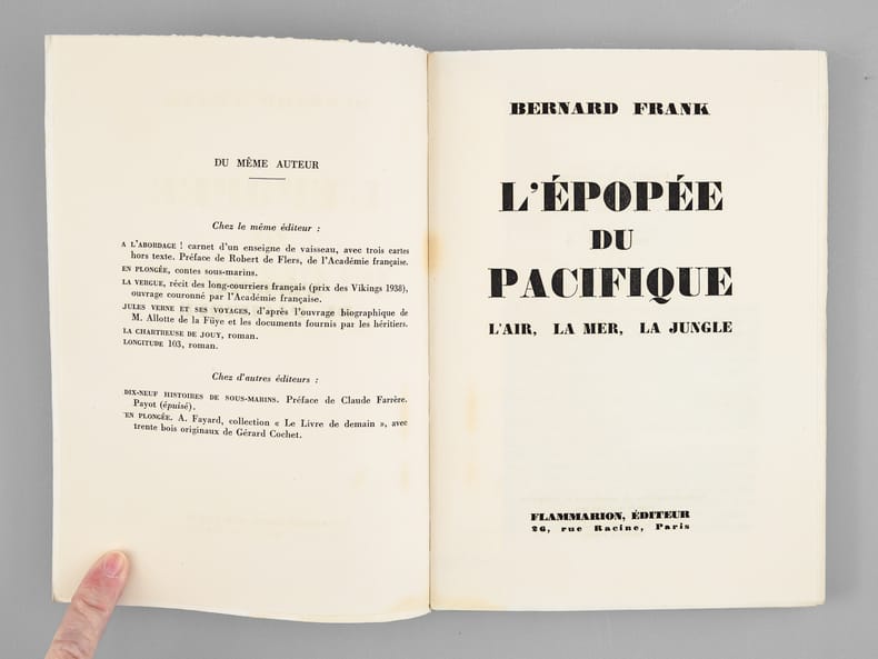 Rare exemplaire du tirage de tête sur alfa. L'universitaire Bernard Frank (1926-1996) deviendra titulaire de la chaire de civilisation japonaise au Collège de France. Etat très satisfaisant (tahes brunes en dos, très bon état par ailleurs).