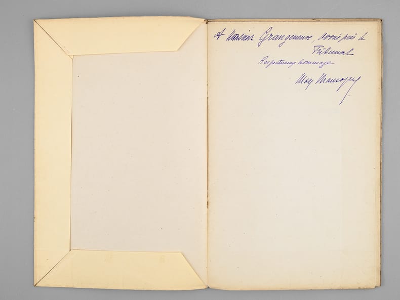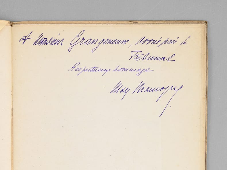 Bon état pour cette brochure peu commune, dédicacée à M. Grangeneuve, avoué près le Tribunal.