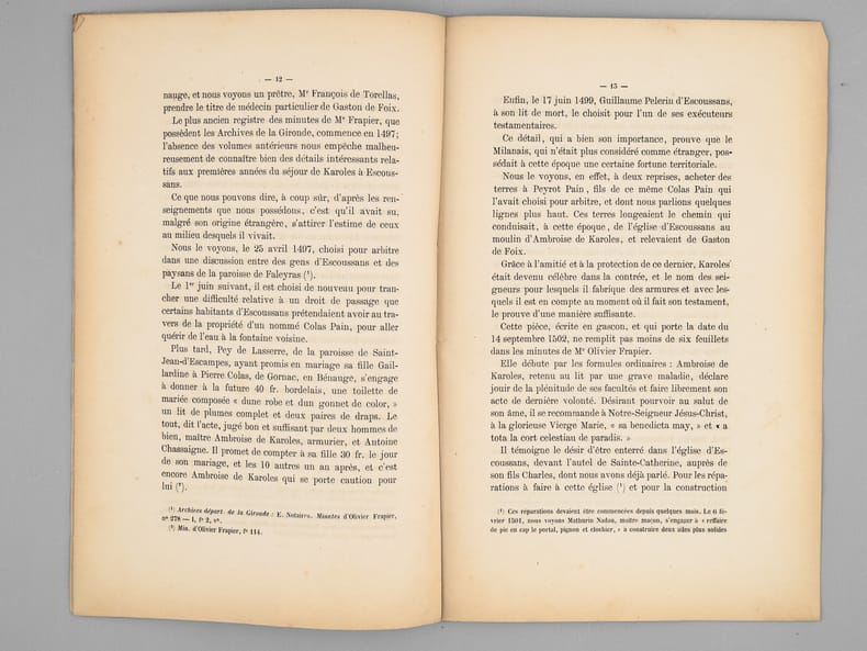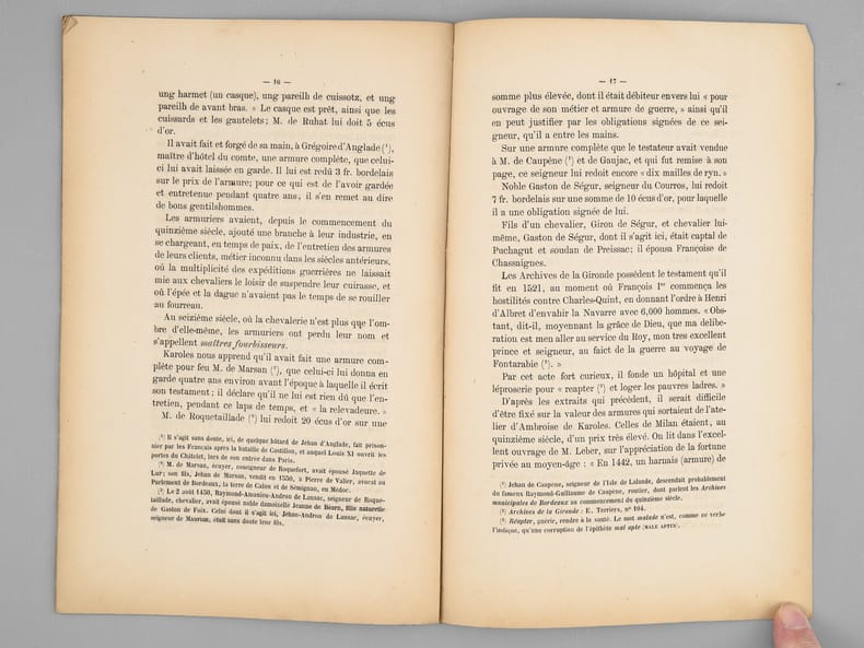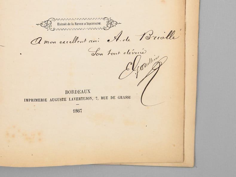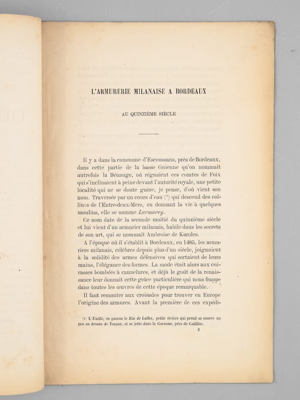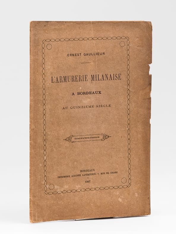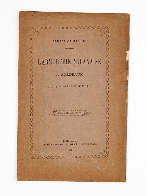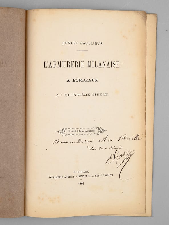 Envoi de l'auteur "A mon excellent ami A. de Briolle, son tout dévoué E. Gaullieur". Rare exemplaire de l'édition originale de cet article évoquant l'armurier milanais Ambroise de Karoles, établi à Bordeaux en 1485.