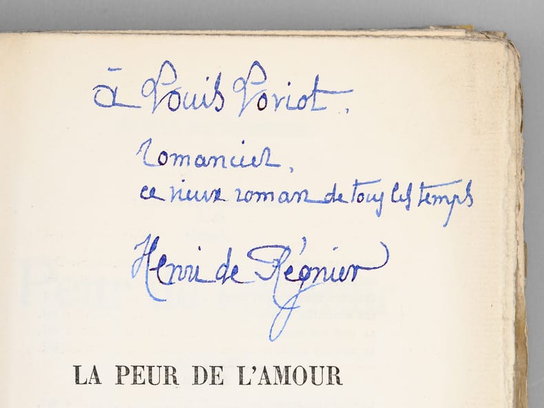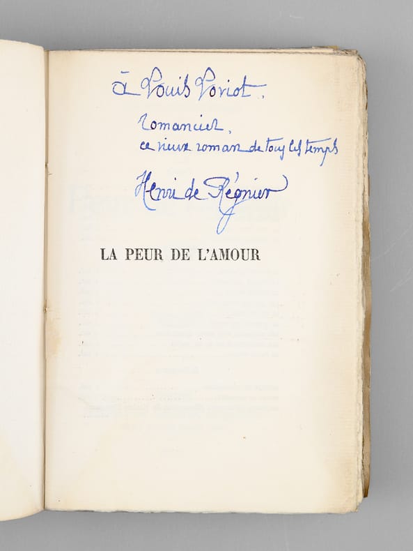 Envoi d'Henri de Régnier "à Louis Loriot, romancier, ce vieux roman de tous les temps". Bon état (tranche sup. empoussierrée, très bon état par ailleurs).