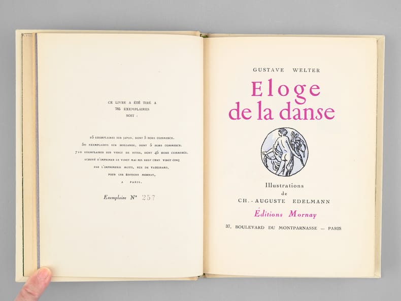 Illustrations de Ch.-Auguste Edelmann, tirage à 785 exemplaires, un des 710 sur vergé de Rives numérotés (n° 257), 1 vol. petit in-8 cartonnage bradel crème, couvertures conservées, tranche sup. mouchetée, reliure signée de Recurt, Editions Mornay, Paris, 1925, 55 pp.