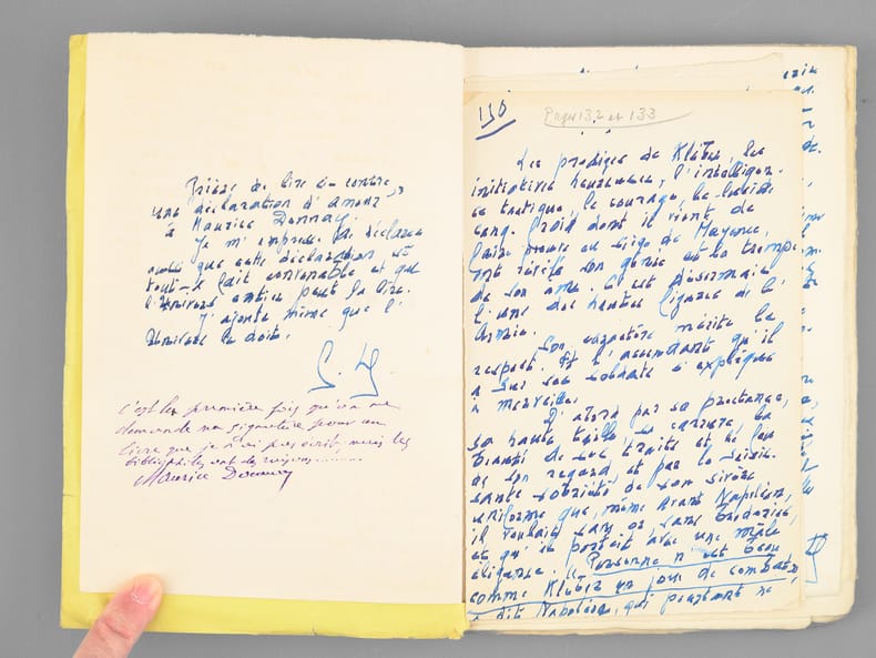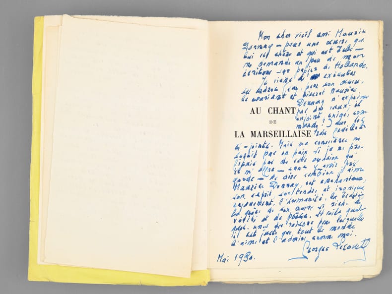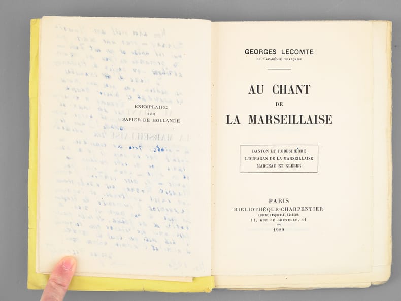 Remarquable exemplaire, enrichi d'un très long envoi autographe signé de Georges Lecomte, véritable "déclaration d'amour à Maurice Donnay" tout-à-fait "convenable" et de 3 feuillets autographes joints (copie manuscrite du texte des pages 132 et 133). On y trouvera également un envoi autographe signé de Maurice Donnay : "C'est la première fois qu'on me demande ma signature pour un livre que je n'ai pas écrit, mais les bibliophiles ont des raisons...". Bel exemplaire du tirage de tête sur papier de hollande et richement dédicacé.