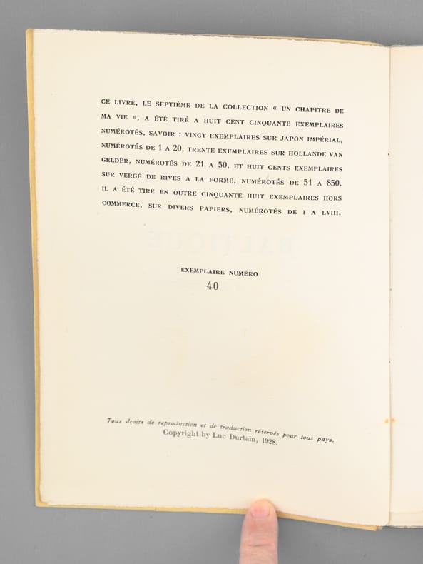 Un des 30 exemplaires sur hollande van Gelder numérotés de 21 à50 (après 20 Japon), numéro 40, 1 vol. petit in-8 br., sous couverture rempliée, Emile Hazan et Cie Editeurs, Paris, 1928, 112 pp.