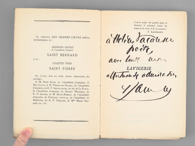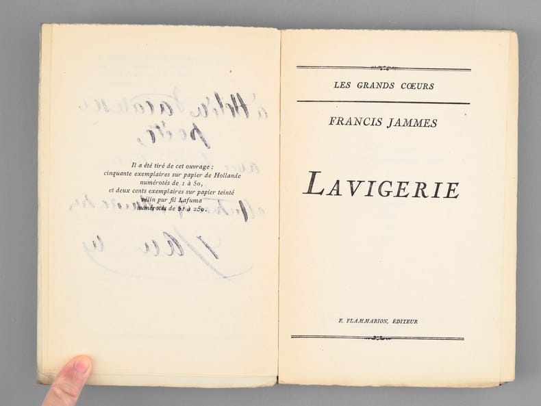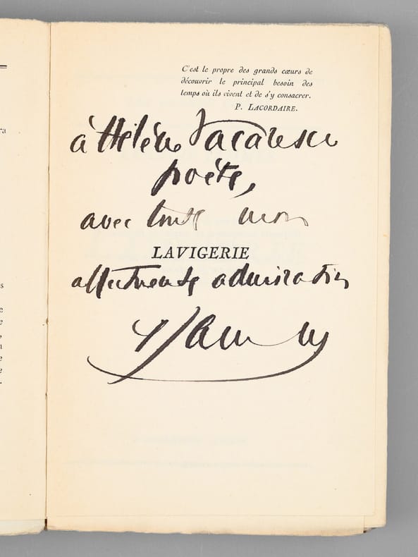 Bel envoi de Francis Jammes "à Hélène Vacarescu poète avec toute mon affectueuse admiration". Femme de lettres et diplomate, Hélène Vacaresco (1864-1947) fut deux fois lauréate de l'Académie française dans l'année 1925. Bon état (couv. un peu frottée)