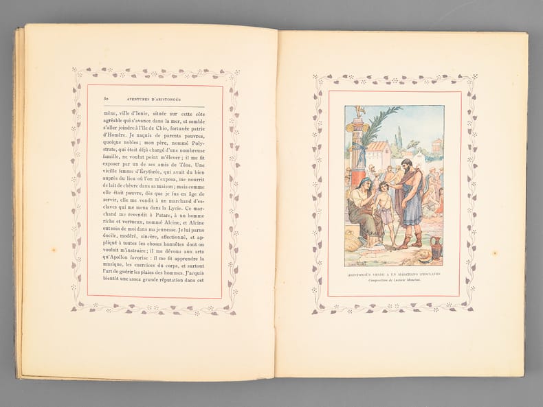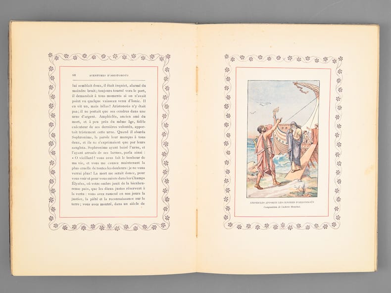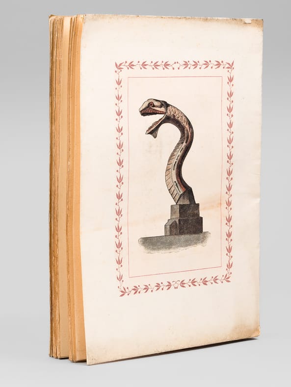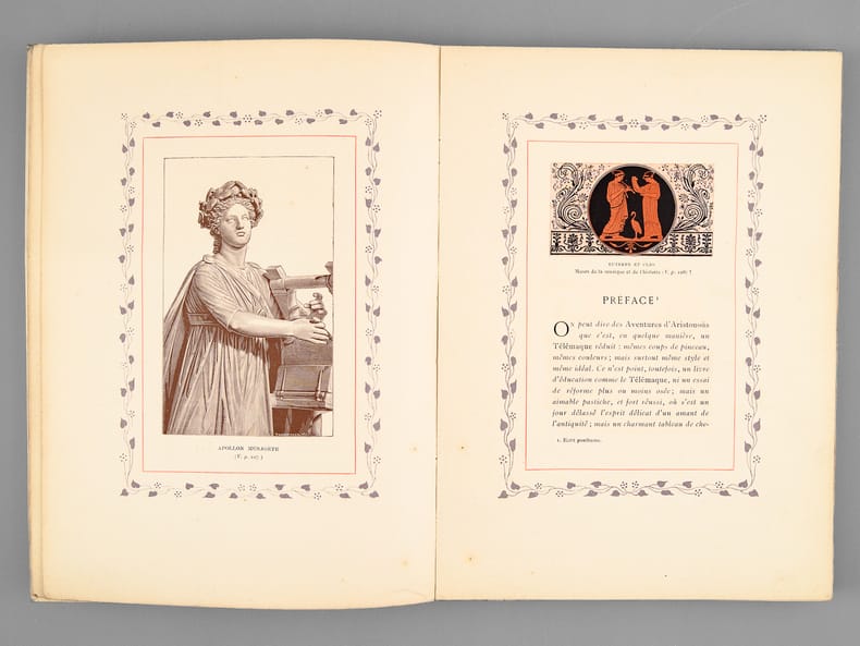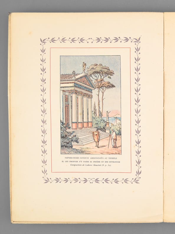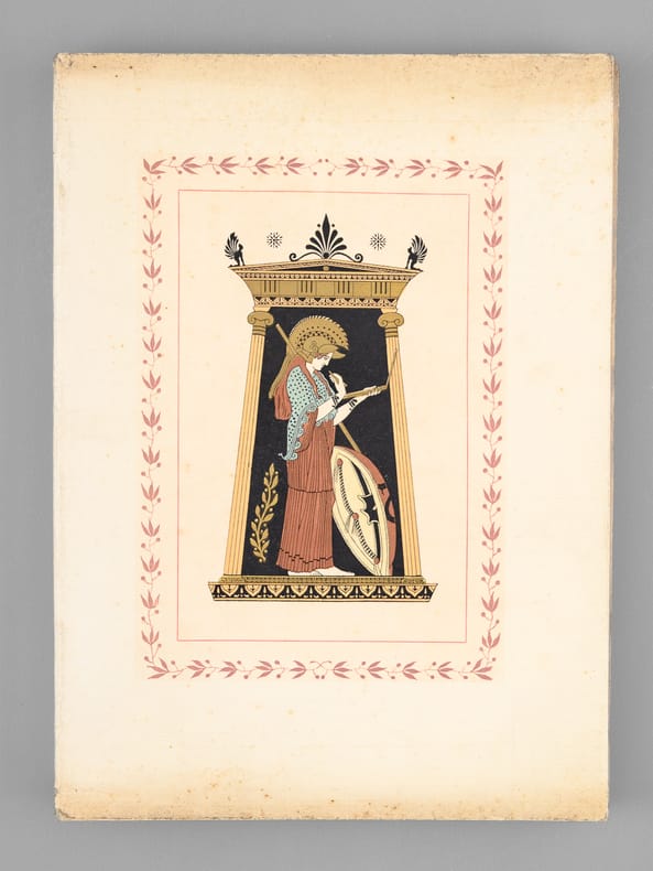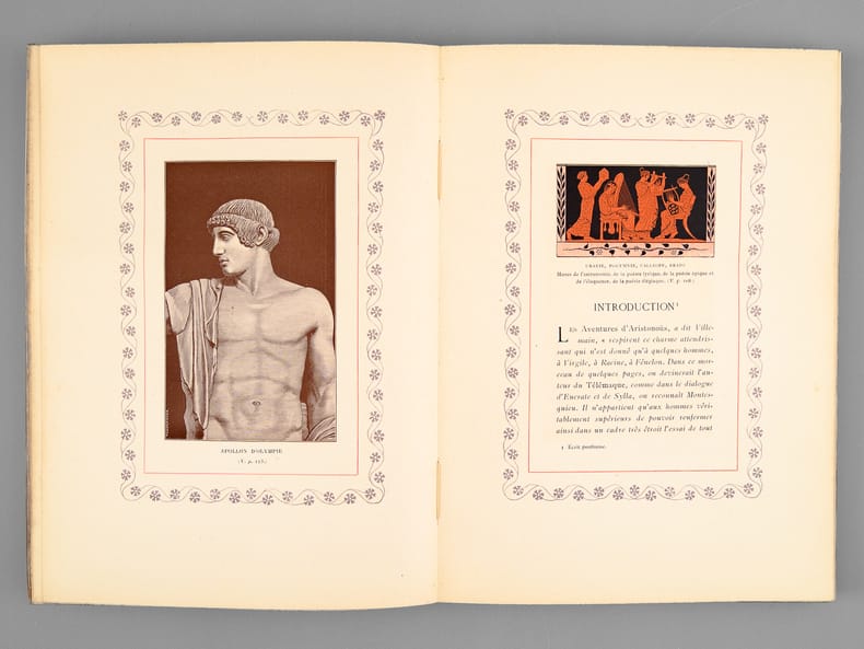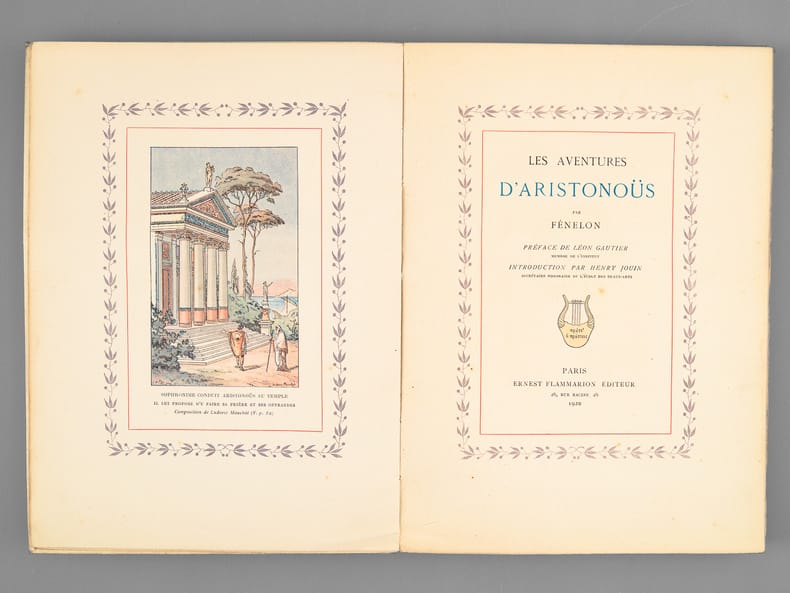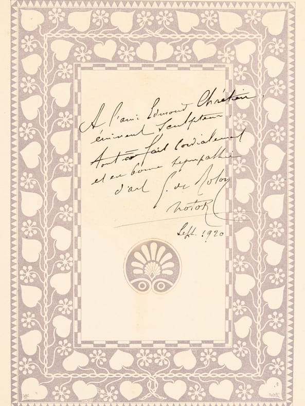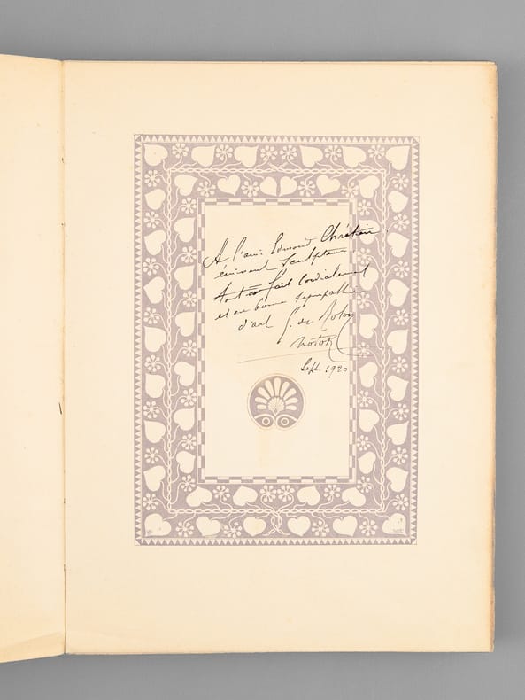 Bel envoi de l'illustrateur Gabriel de Roton dit "Notor", "à l'ami Edmond Chrétien, éminent sculpteur, tout à fait cordialement et en bonne sympathie d'art". Edmond Chrétien a réalisé de nombreux monuments aux morts en Gironde. L'ouvrage est remarquablement illustré par Notor de motifs reprise de la céramique grecque antique. Etat très satisfaisant (dos un peu frotté avec 2 taches, bon état par ailleurs)