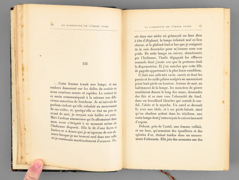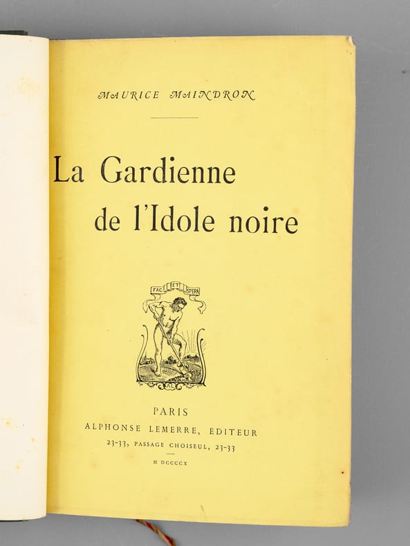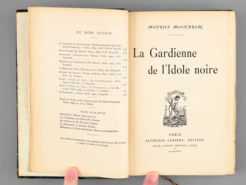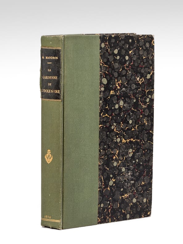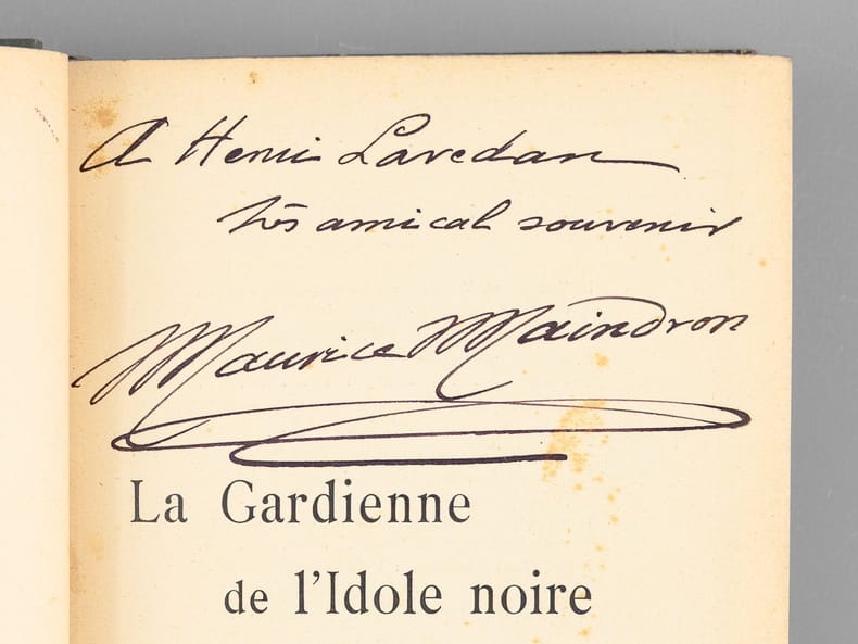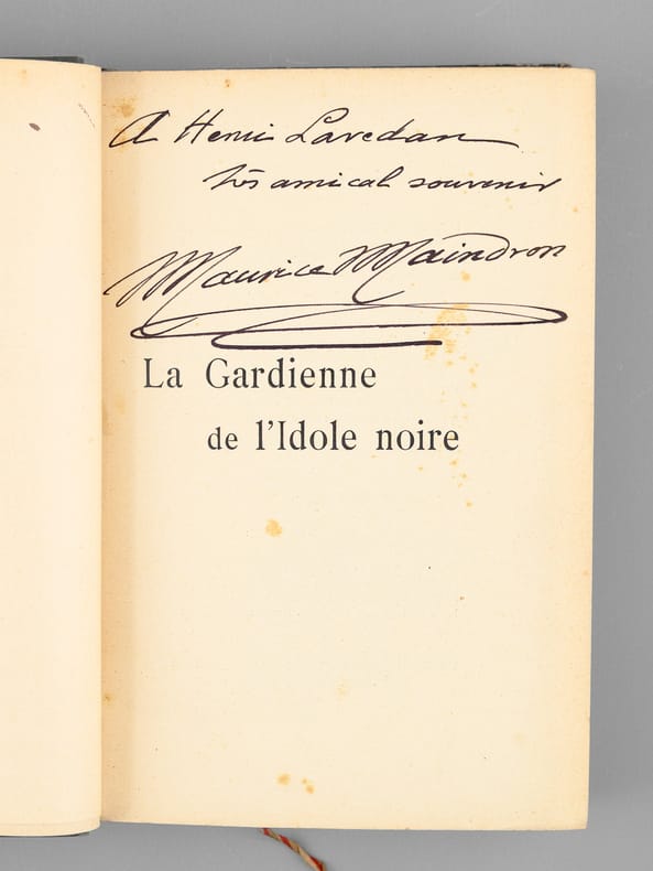 Envoi de Maurice Maindron à l'écrivain Henri Lavedan. Ce recueil contient 5 nouvelles : "La Gardienne de l'Idole noire ; Histoire du berger Nicolas et de la demoiselle Monette ; La Légende singulière et naïve des Sept Dormants d'Ephèse ; Véridique Histoire de la Vierge Marine ; Le miraculeux serpent de Fondi. Bon état