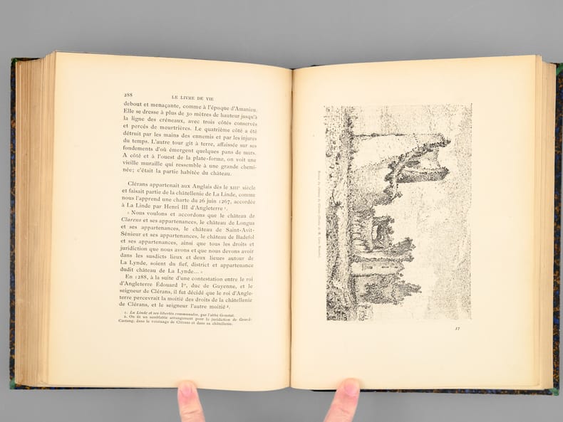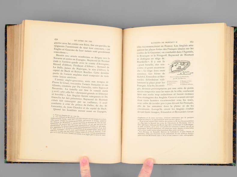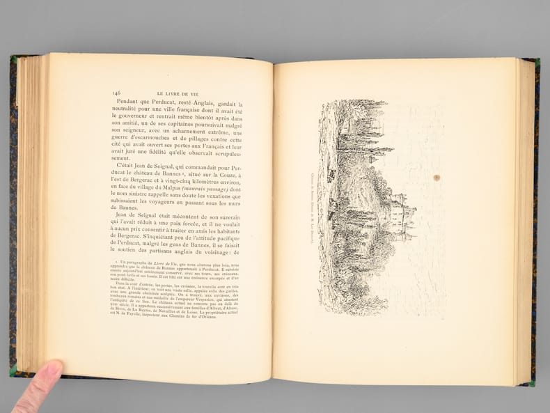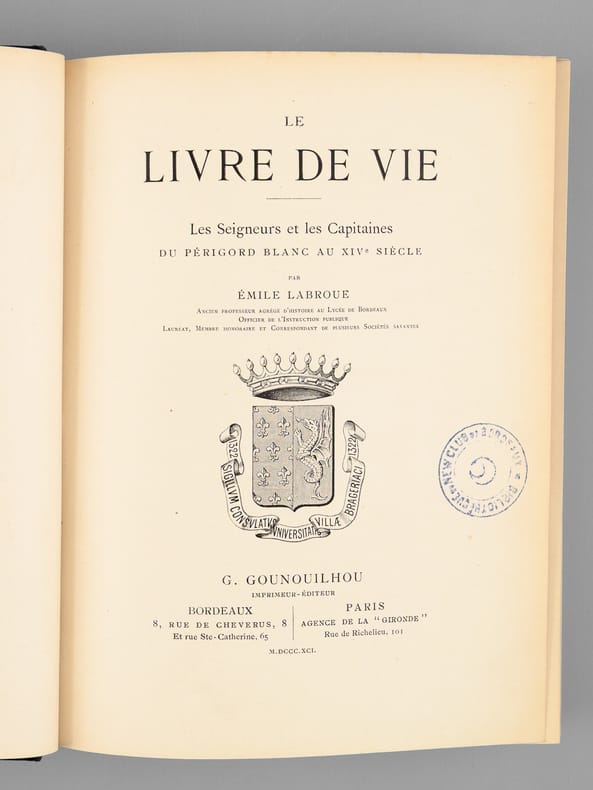 Très bel exemplaire réunissant les deux ouvrages consacrés par le professeur Emile Labroue au Périgord Blanc et à Bergerac. L'auteur précise dans la préface à cette seconde édition de "Bergerac sous les Anglais" : "Notre éditeur bordelais, M. G. Gounouilhou, qui ne néglige aucune occasion de mettre en lumière tout ce qui intéresse l'histoire de Bergerac, sa ville natale, a pensé qu'il convenait de présenter au public, sous un même format, nos deux études d'histoire provinciale, "Bergerac sous les Anglais" et "Le Livre de Vie", et de faire ainsi, en deux volumes in-4, comme une "Histoire de Bergerac au XIVe siècle". C'est avec plaisir que nous avons répondu à son invitation, et nous publions aujourd'hui une seconde édition de "Bergerac sous les Anglais".