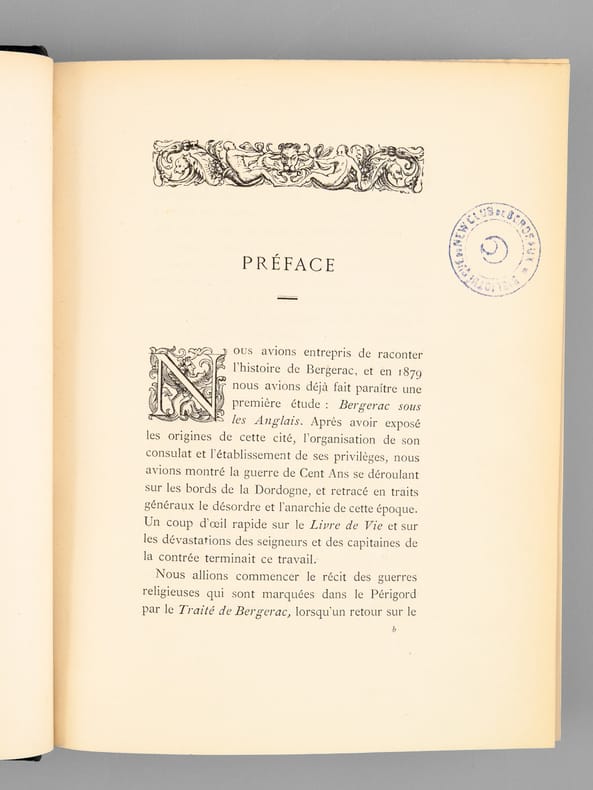 Edition Origianle. G.Gounouilhou imprimeur-éditeur à Bordeaux, J.Rouam et Cie éditeurs, Pairs, 1891, 456 pages. Gravures et un plan dépliant du vieux Bergerac (Bragera) à la fin du Moyen Age sur lequel il a été dessiné un projet de fortifications dressé par Vauban. Complet, intérieur bon, mais dos et couture des cahiers à refaire. Broché. Couverture factice sous papier cristal, manques. A toutes marges