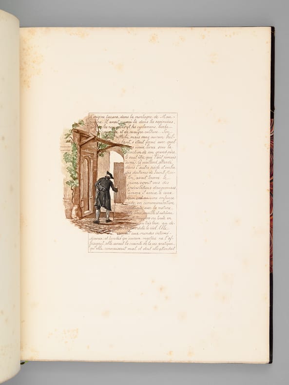Paris : G. Boudet (successeur de la Librairie artistique H. Launette et Cie), 1889. Dans un étui gris bordé de cuir gris, in-folio (36x29 cm) relié en cuir gris foncé, reprenant en premier plat la couverture en soie d'origine ; [31] feuilles avec cadre d'enfoncement, texte calligraphié imprimé, 29 gravures en taille-douce bistre et couleurs de Le Comte de L'Aigle, imprimées par Charles Chardon Aîné. Envoi autographe de Melchior de Vogüé (Noël 1888) en page de faux-titre. Un des 525 exemplaires du tirage sur papier vélin (non numéroté, mais encré d'une paire de guillemets). Élégante reliure signée (marque dorée de l'Abbaye Notre-Dame d'Igny). Ex-libris du bibliophile Louis Camus. [BE, quelques rousseurs diffuses]