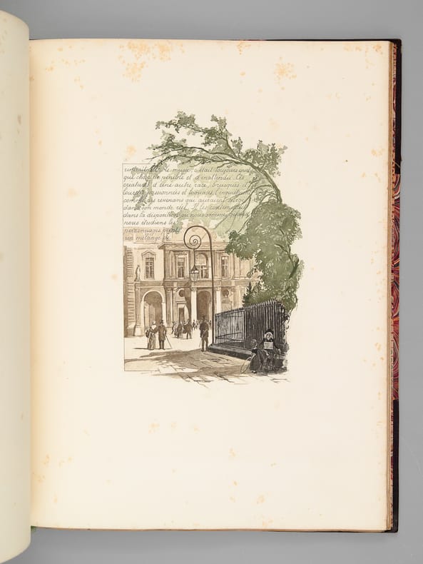 1889 Paris, Librairie artistique - H. Launette et Cie, G. Boudet Succr, 1889 ; in- folio en feuilles de (2) ff. (faux-titre, titre illustré) et 29 feuillets chiffrés, sous cartonnage de l'éditeur crème illustré et imprimé au 1er plat, dos muet. Ouvrage illustré dans le texte et à pleine page de gravures en noir ou en couleurs. Impression en italiques, texte encadré d'un filet maigre. Impression en taille douce par Ch. Chardon, 10 rue de l'Abbaye , Paris. Tirage total à 525 exemplaires numérotés, ici 1 des 500 sur papier velin.