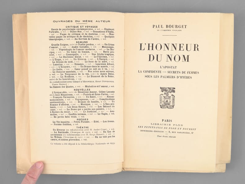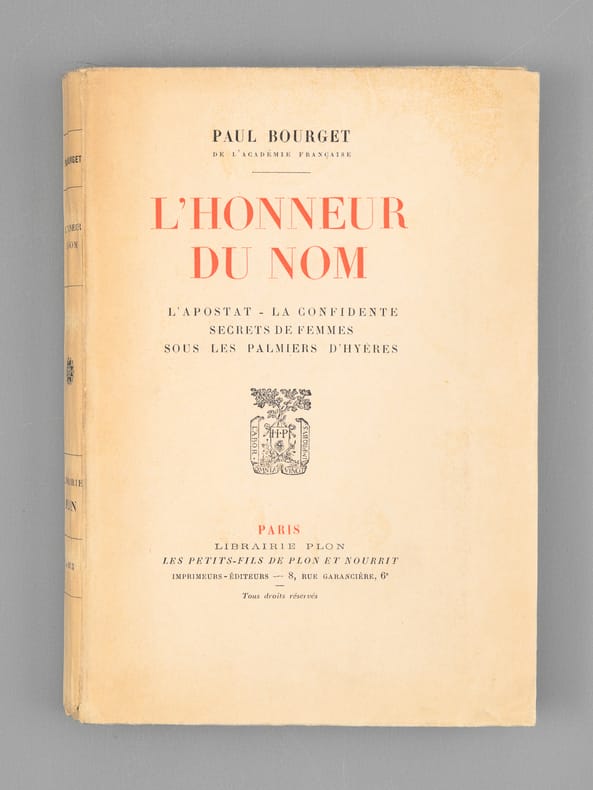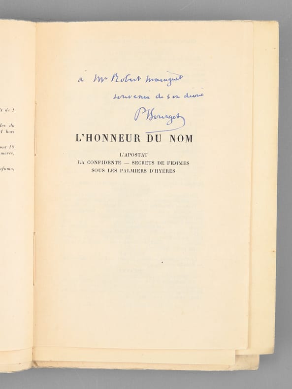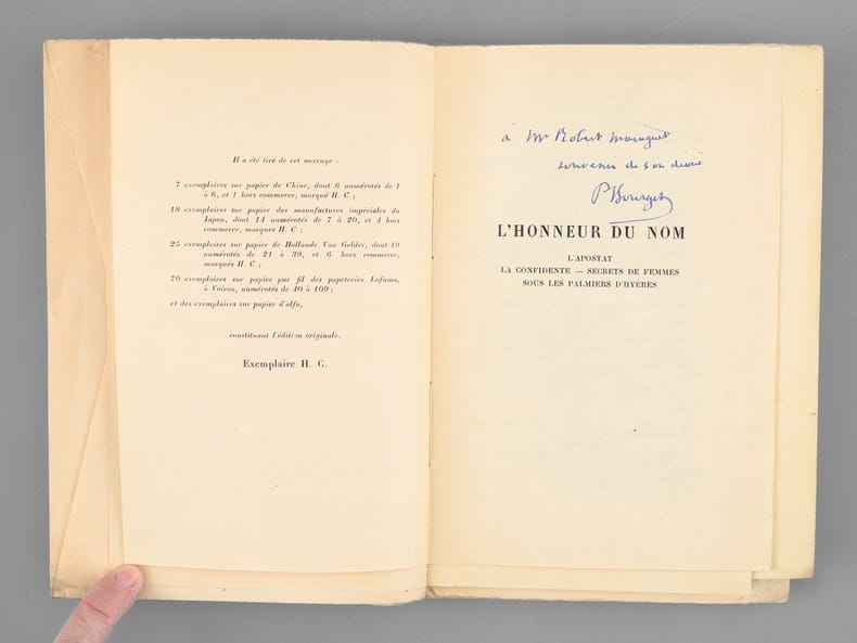 Bon exemplaire du tirage du japon, dédicacé par Paul Bourget à Robert Mainguet. Il s'agit de l'avant-dernier recueil de nouvelles rédigé par Palul Bourget (1852-1935)