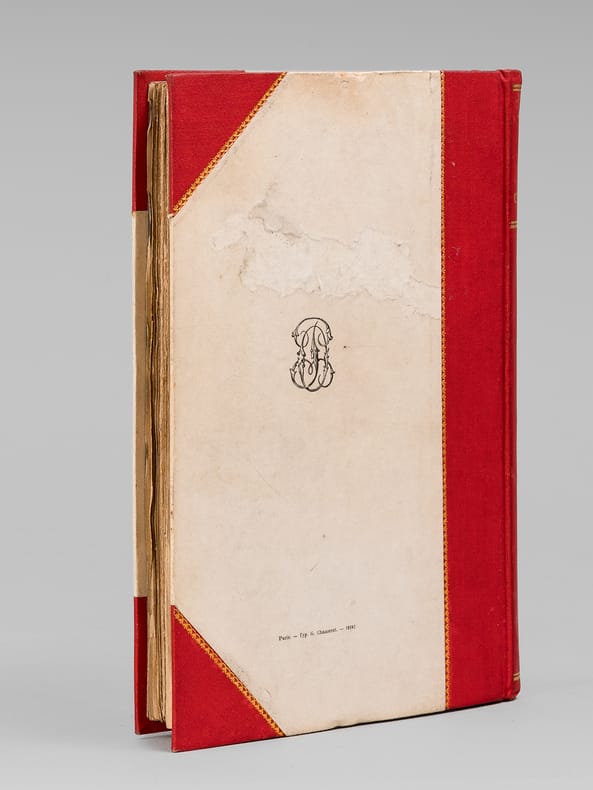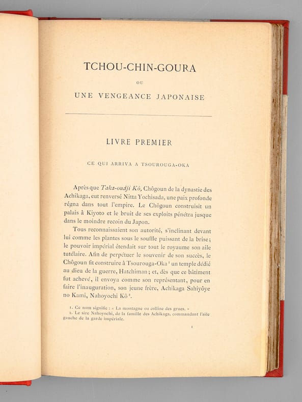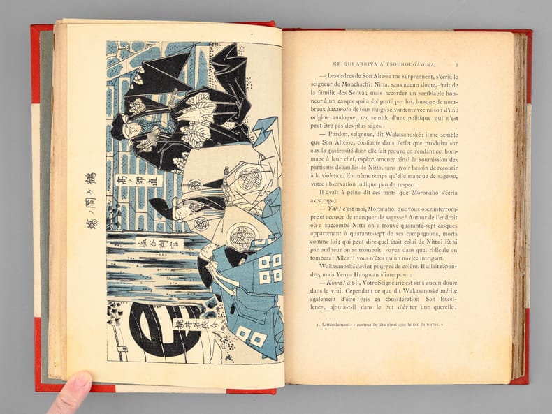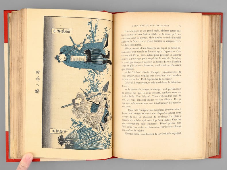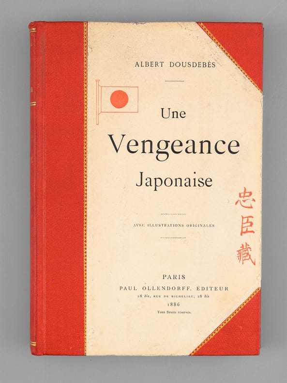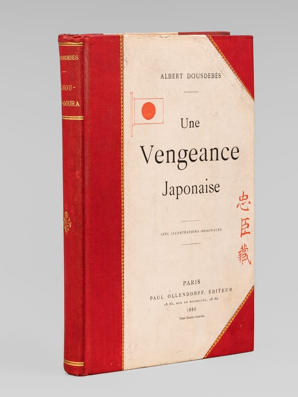 Traduction française de Albert Dousdebès, nombreuses gravures sur bois exécutées au Japon par des artistes japonais et tirées sur papier japonais, 1 vol. in-8 cartonnage demi-percaline à coins rouge, couv. illustrée, tête dorée, Paul Ollendorff, Paris, 1886, 2 ff., II pp., 1 f., 224 pp. avec 35 planches hors texte sur papier japonais