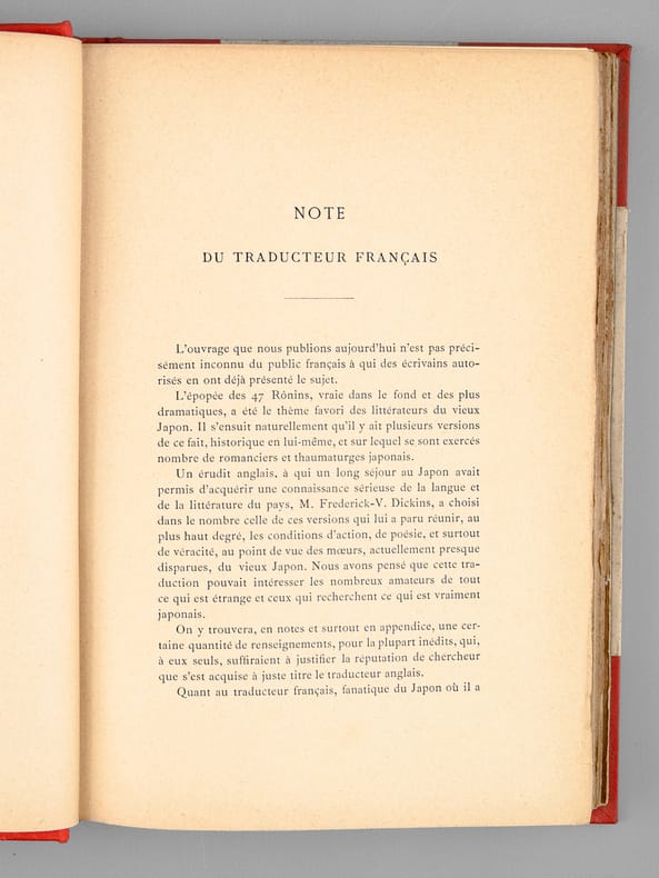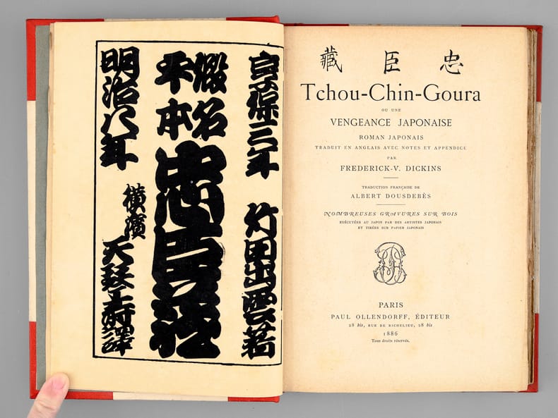 Belle traduction française du roman des 47 Ronins, illustrée de 35 belles gravures sur bois sur papier japon. Bon état (manque de papier au second plat, bon exemplaire par ailleurs)