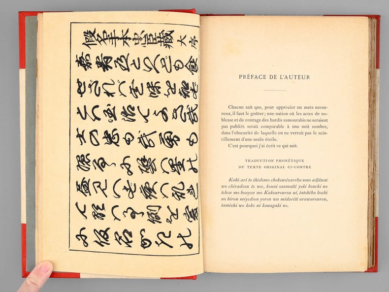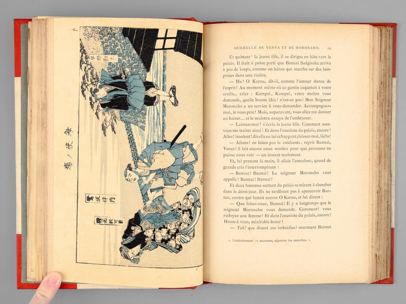 Rare édition originale française sur papier courant, après 50 Japon, de ce roman japonais, publié en plein mouvement japoniste et illustré de véritables estampes japonaises.1 frontispice (calligraphie japonaise), une préface en japonais, 4 planches de specimens de textes originaux en alphabet Hirakana in-fine et 29 planches illustrées hors texte tirées en noir et bleu, gravures sur bois exécutées au Japon par des artistes japonais et tirées sur papier Japon fin.Envoi autographe signé du traducteur français : "A ma chère Gabrielle, Paris, 28 novembre 1885, Alb. Dousdebès".Un très beau livre.