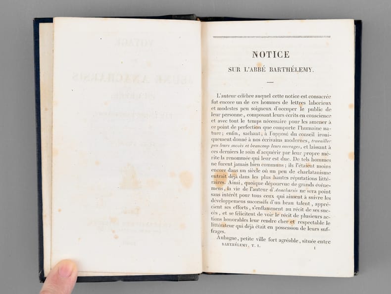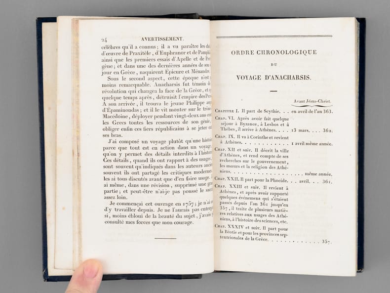 "Je suppose qu'un Scythe, nommé Anacharsis, vient en Grèce quelques années avant la naissance d'Alexandre, et que d'Athènes, son séjour ordinaire, il fait plusieurs voyages dans les provinces voisines, observant par-tout les moeurs et les usages des peuples, etc..."