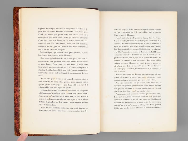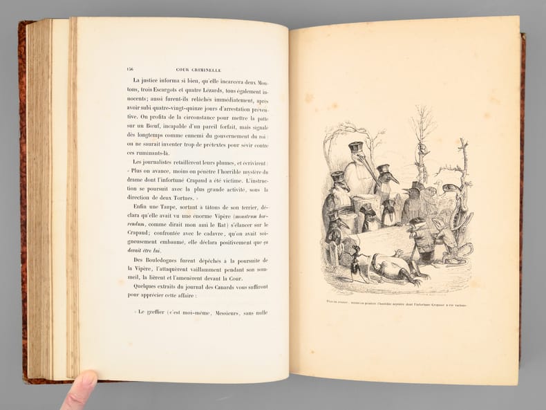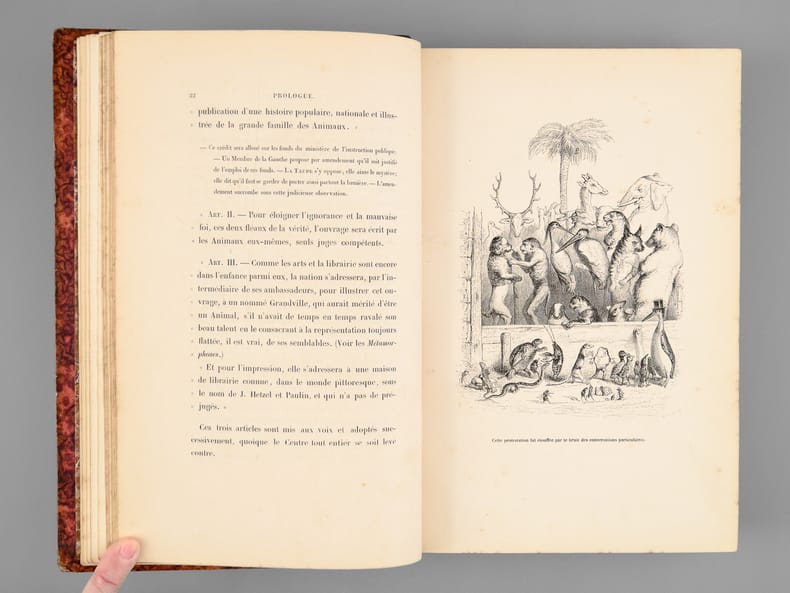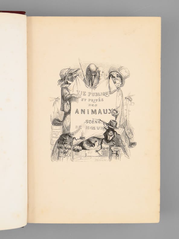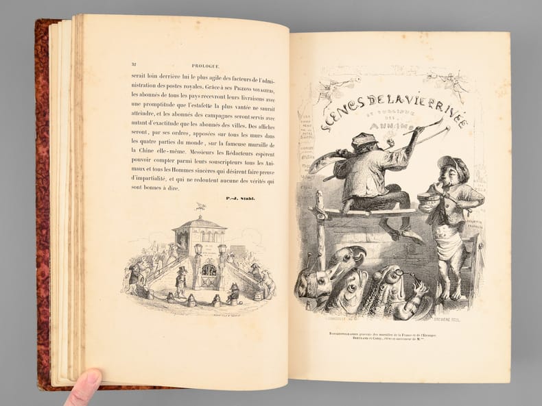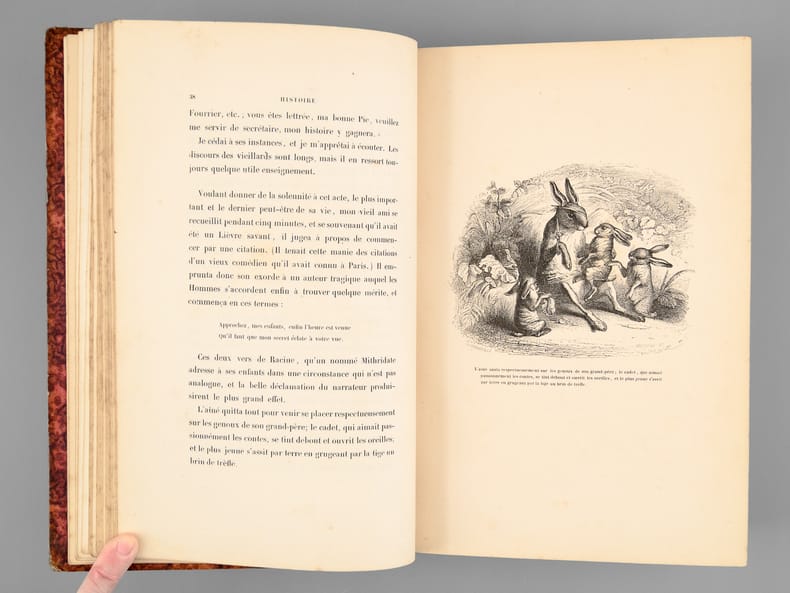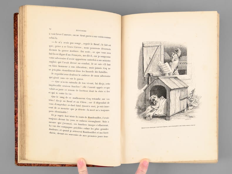 Vignettes par Grandville, 2 vol. grand in-8 reliure demi-maroquin rouge, dos à 4 nerfs, Tome I : J. Hetzel et Paulin, Paris, 1842, 4 ff., 386 pp. et 3 ff. n. ch. et 1 f. blanc, avec 96 planches hors texte, Tome II : J. Hetzel, 1842, 2 ff., 390 pp., 3 ff. n. ch. et 1 f. blanc avec 105 planches hors texte