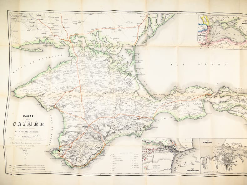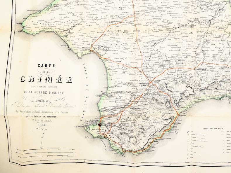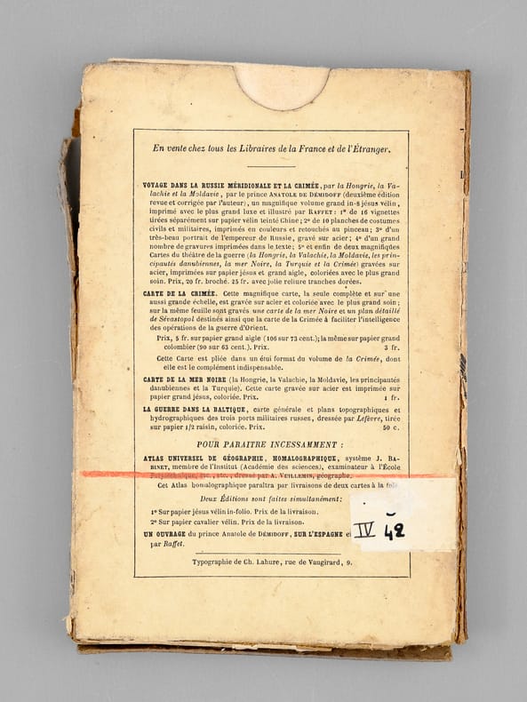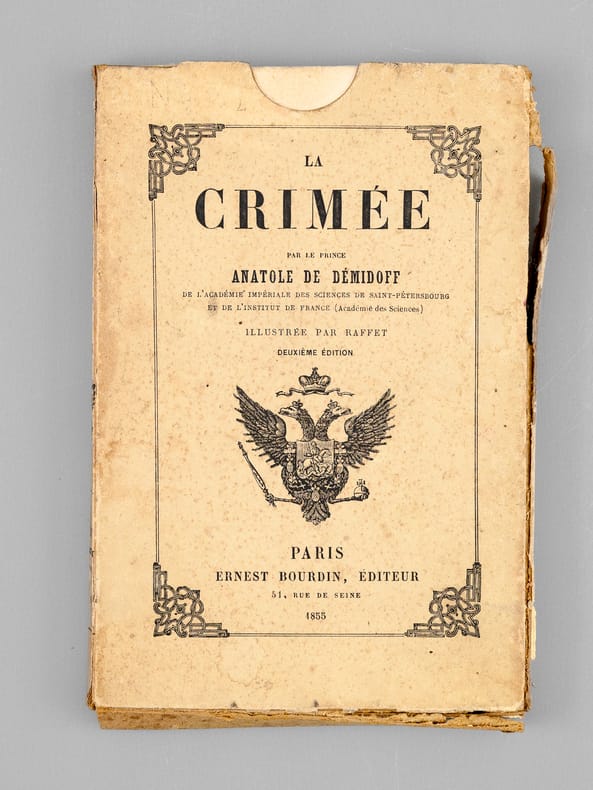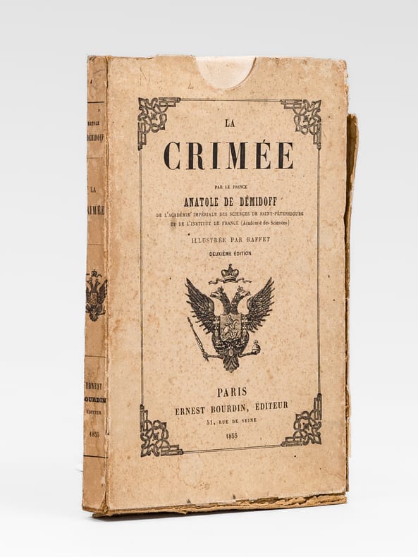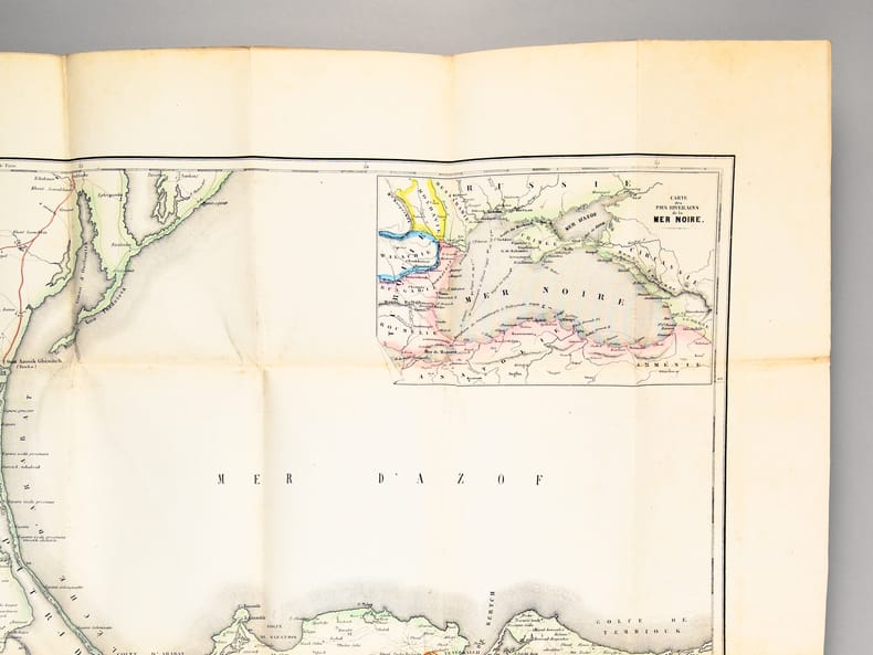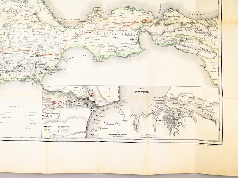Cette superbe carte de la Crimée présente également deux petits plans de la bataille de l'Alma (20 septembre 1854) et du "Port de Sevastopol". Ainsi que le précise le texte de l'étui, "cette magnifique carte, la seule complète et sur une aussi grande échelle, est gravée sur acier et coloriée avec le plus grand soin". Il s'agit ici du tirage le plus grand sur papier grand aigle (106 sur 73 cm) ; il existe aussi un tirage plus petit sur papier grand colombier (90 sur 63 centimètres). "Cette carte est pliée dans un étui format du volume de "la Crimée" dont elle est le complément indispensable". La notice fait ici référence à l'édition abrégée au format in-18 du "Voyage dans la Russie Méridionale et la Crimée" du Prince Demidoff, publié par Bourdin en 1855 (Vicaire, III, 169). La carte est en très bon état (très petite fente à un pli en marge), l'étui est très usagé (manque de cartons, reste d'étiquette de cote au verso de l'étui).