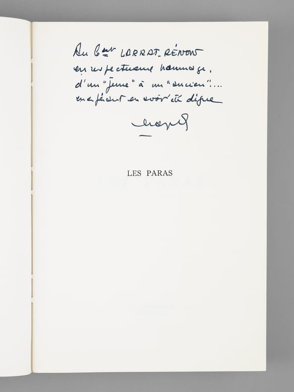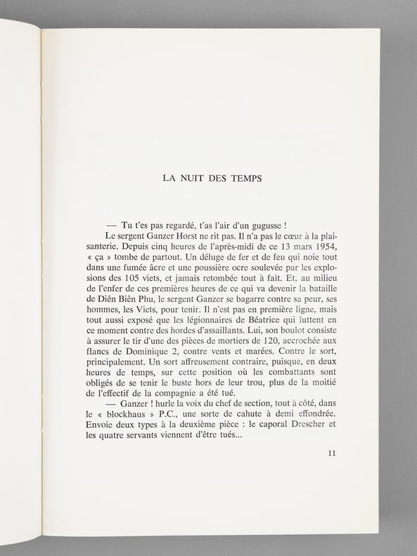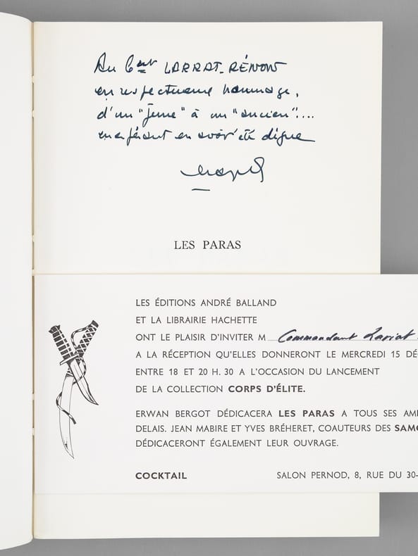 Bel envoi d'Erwan Bergot "au Commandant L...R... en respectueux hommage d'une "jeune" à un "ancien".. en espérant en avoir été digne". Bon état. L'ouvrage est accompagné du carton d'invitation de l'éditeur à l'occasion du lancement de la collection "Corps d'Elite".