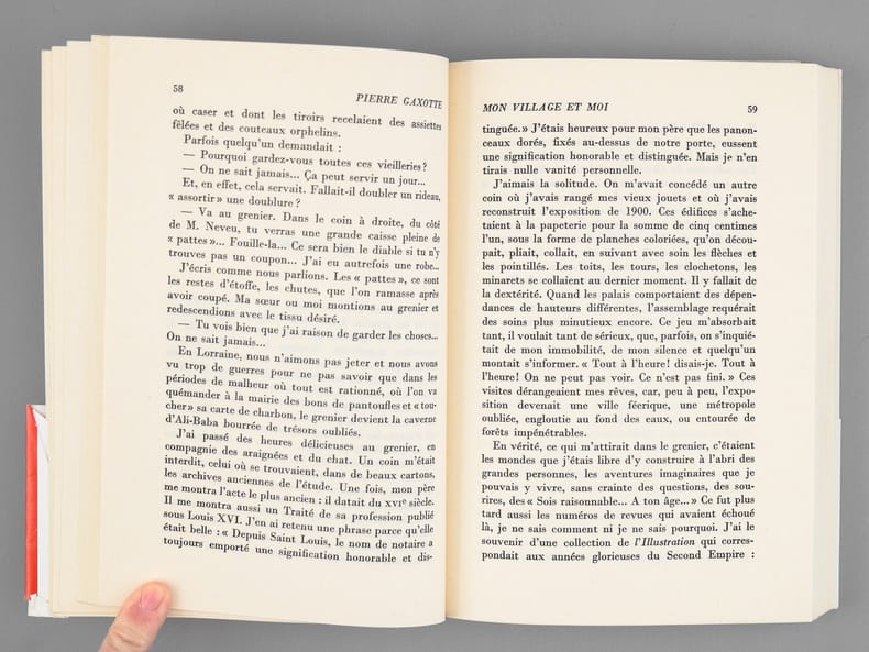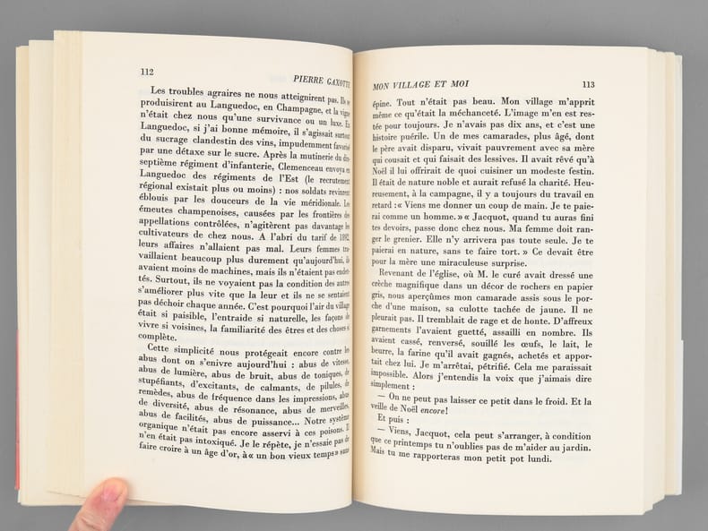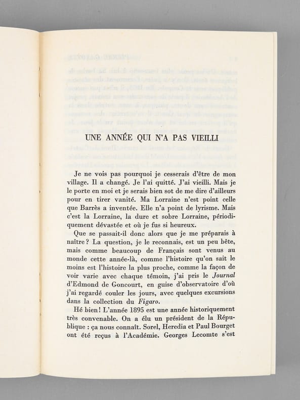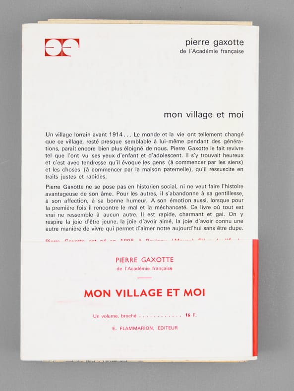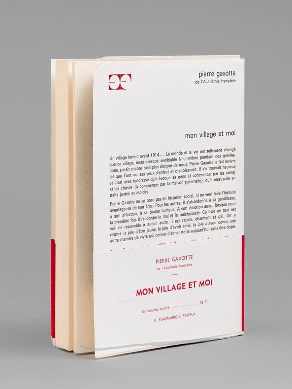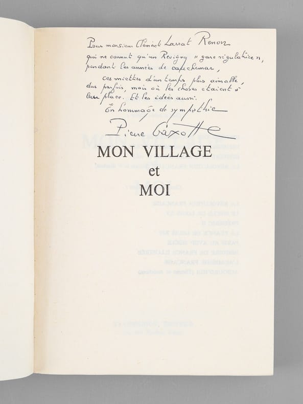 Bel envoi autographe de Pierre Gaxotte à M. C..L...R... "qui ne connut qu'un Revigny "gare régulatrice" pendant les années de cauchemar, ces miettes d'un temps plus aimable, dur parfois, mais où les choses étaient à leur place. Et les idées aussi. En hommage de sympathie". Pierre GAxotte a également corrigé un nom dans le texte. Bon état pour cet exemplaire enrichi d'un bel envoi évoquant nommément le village natal de Pierre Gaxotte, Revigny-sur-Ornain, dans la Meuse.