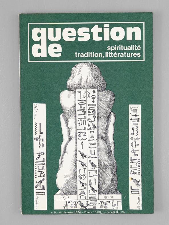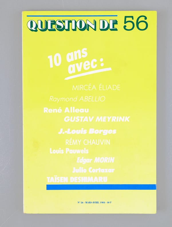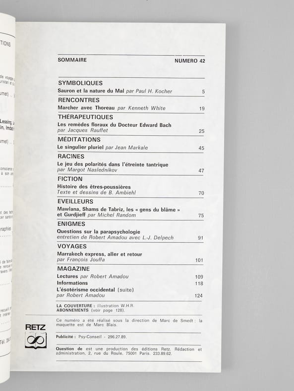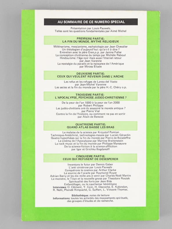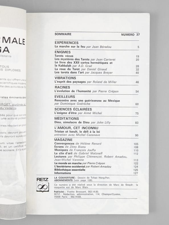 61 vol. in-8 br. Bibliothèque Retz, CELT Centre d'Etudes Littéraires et Traditionnelles, 1973 à , env. 125 pp. par numéro. Au sommaire notamment : La journée d'un moine zen ; John Lillyn l'expérience dans l'eau ; Plus personne pour comprendre les mystiques ? L'étrange hypothèse du Dr. Gravier (trad. par Lanza del Vasto) ; Le mythe de Faust et la genèse du surhomme ; Pour mieux comprendre l'islam mystique ; La médecine sacrée de l'Egypte ; Où sont les jésuites ? La spiritualité dans l'Inde d'aujourd'hui ; Lanza del Vasto et la non-violence (entretien avec Louis Pauwels) ; Réponse à une enquête sur la crise de l'Eglise (Louis Pauwels) ; Où en sont les Dominicains ? Un calculateur astronomique de 2000 ans, la machine d'Antikythera ; Les Chartreux aujourd'hui ; Les chemins de la science et de la foi (par Rémy Chauvin) ; La franc-maçonnerie est-elle spirituelle ? Rudolf Steiner, prophète de l'âme moderne (par Claudine Brelet-Rueff) ; André Breton et l'hermétisme alchimique ; Numéro spécial La fin du monde ; Les judéo-chrétiens ont-ils assassiné le monde antique ? La presse soviétique et les extra-terrestres ; Comment devient-on ce que l'on est ? (par Louis Pauwels) Hommage à Jacques Bergier ; La France des sorciers (n° 38) ; Le retour de C.G. Jung (n° 39) ; La Dame à la Licorne (n° 40) ; Vrai Zen ; Tolkien ; Nostradamus, un poète? Sur les pas de Bouddha ; Le Livre des morts tibétains ; Calligraphie les mots vivants ; Les thérapies de groupe ; Le message de Maître Taïsen Deshimaru ; Textes inédits de Sri Aurobindo (n°49); Gurdjieff, textes et témoignages inédits (n°50) ; L'alchimie aujourd'hui (n°51) ; Le théâtre et le sacré (n° 52) ; La gnose éternelle (n° 53) ; La musique et l'esprit (n°54) ; Les arts divinatoires (n°55) ; Le pouvoir des contes (n°57) ; Poésie, l'alphabet de lumière (n°58) ; Mythes et histoire (n°58) ; Alexandra David-Neel, Voyages et aventures de l'esprit (n°60) ; Tibet, une culture en exil, Textes du Dalï Lama et témoignages inédits (n° 61) Astrologies (n° 62); Racines et secrets de la fran-maçonneries (n°63) ; Médecines nouvelles et psychologies transpersonnelles (n°64) ; L'Esprit des Hauts lieux (n°65); L'Apocalypse de Jean (n°68); Prière, Colloque de Sénanque (n°69); Demeures du Sacré (n°70) ; La structure absolue, Raymond Abellio (n°72).