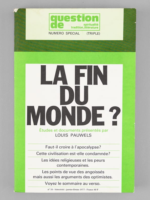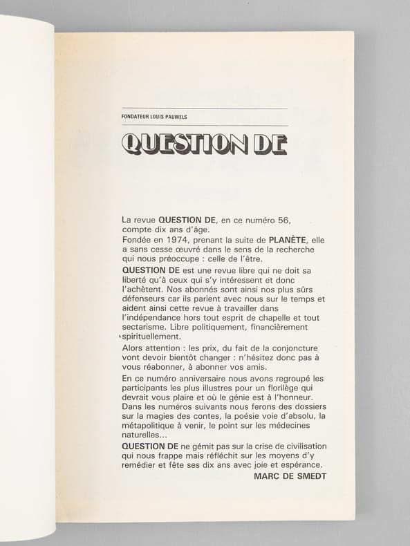 Etat très satisfaisant (1 dos très frotté, quelques traces sur couv., bon état par ailleurs, avec intérieurs frais), pour ces 14 années de cette revue. Sur 72 numéros, ne manquent que les n° 21, 22, 23, 24, 25, 34, 43, 66, 67 et 71. La revue "Question de" fut créée à la suite de la fameuse revue Planètes, du duo Louis Pauwels et Jacques Bergier. Peu courant.