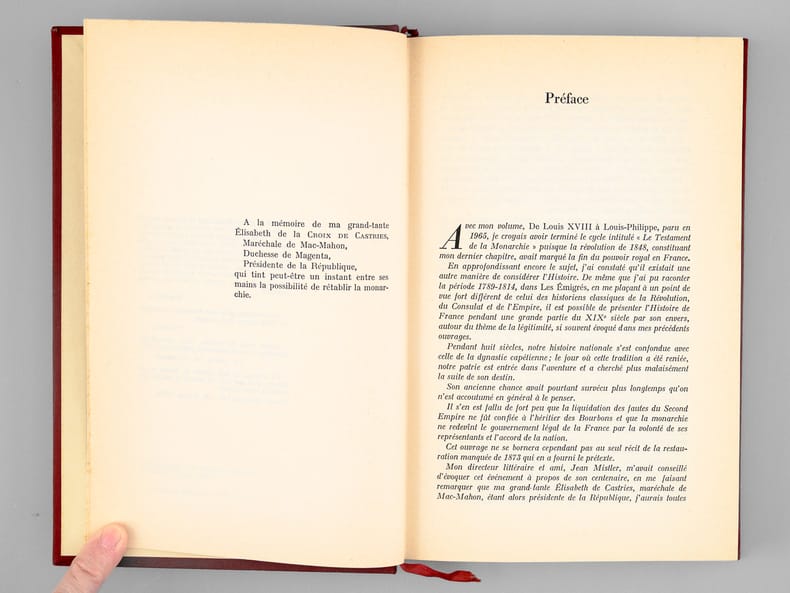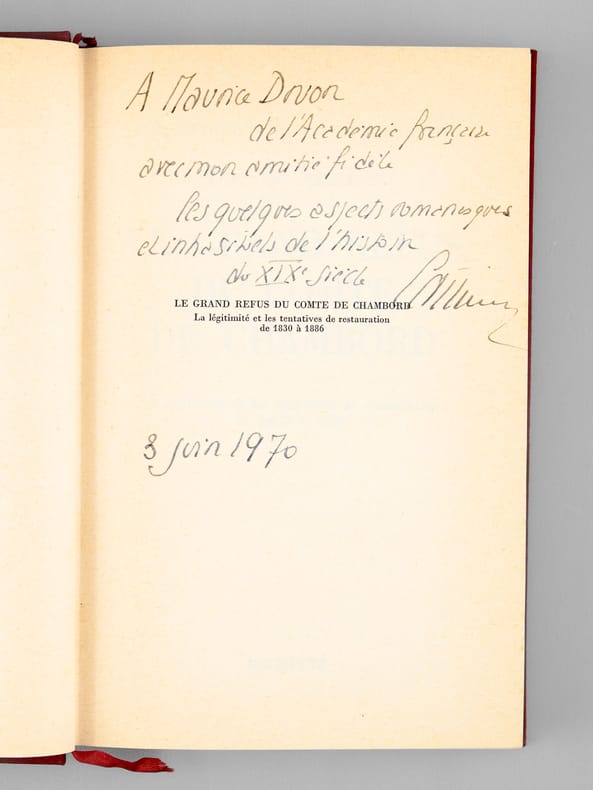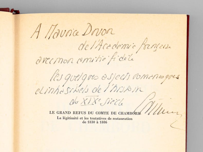 Envoi de l'auteur à Maurice Druon : "A Maurice Druon, de l'Académie française, avec mon amitié fidèle, ces quelques aspects romanesques et inhabituels de l'histoire du XIXe siècle.". L'auteur et le dédicataire devinrent tous deux académiciens. Maurice Druon (1918-2009), auteur notamment de la célèbre saga historique des Rois maudits, avait été élu à l'Académie Française en 1968. Il en devint le Secrétaire Perpétuel, de 1985 à 1999. L'auteur, quant à lui, sera élu à l'Académie Française en 1972. Etat très satisfaisant (tranches lég. frottées, bon état par ailleurs) pour cet exemplaire, d'une origine prestigieuse.