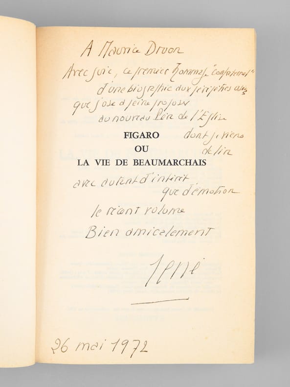 Envoi de l'auteur à Maurice Druon : "A Maurice Druon, Avec joie, ce premier hommage confraternel, d'une biographie aux péripéties osées, que j'ose à peine proposer au nouveau Père de l'Eglise, dont je viens de lire avec autant d'intérêt que d'émotion le récent volume. Bien amicalement". L'auteur et le dédicataire étaient tous deux académiciens. Maurice Druon (1918-2009), auteur notamment de la célèbre saga historique des Rois maudits, avait été élu à l'Académie Française en 1968. Il en deviendra le Secrétaire Perpétuel, de 1985 à 1999. L'auteur, quant à lui, venait juste d'être élu à l'Académie Française, ce qui explique le début de la dédicace. Quant à la mention "Père de l'Eglise" dans la dédicace, elle fait référence à l'essai "Une église qui se trompe de siècle" que venait de publier Maurice Druon. Etat très satisfaisant (couv. lég. frottée et dos plié, bon état par ailleurs). Exemplaire d'une origine prestigieuse.