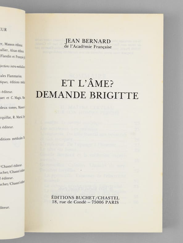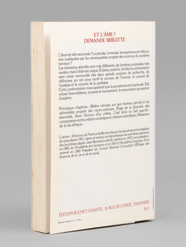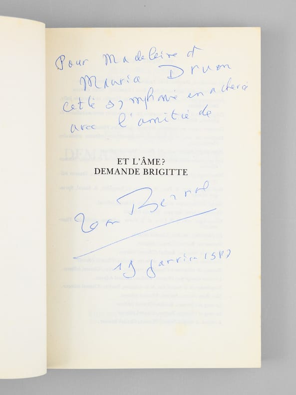 Envoi de l'auteur à Maurice Druon et à son épouse: "Pour Madeleine et Maurice Druon, cette symphonie inachevée. Avec l'amitié de Jean Bernard". L'auteur et le dédicataire étaient tous deux académiciens. Maurice Druon (1918-2009), auteur notamment de la célèbre saga historique des Rois maudits, fut élu à l'Académie Française en 1968. Il en devint le Secrétaire Perpétuel, de 1985 à 1999. L'auteur, quant à lui, fut élu à l'Académie Française en 1975, au fauteuil de Marcel Pagnol. Le professeur Jean Bernard, éminent hématologue et oncologue, présida le Comité National d'Ethique de 1983 à 1993. Etat très satisfaisant (tranches lég. frottées, bon état par ailleurs) pour cette exemplaire d'une origine prestigieuse.