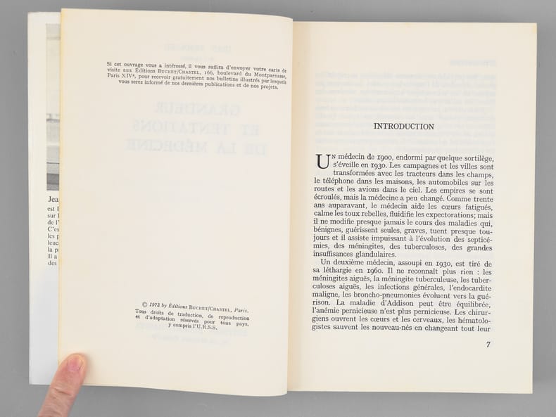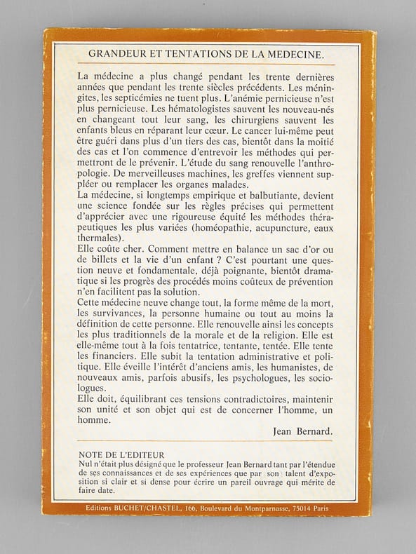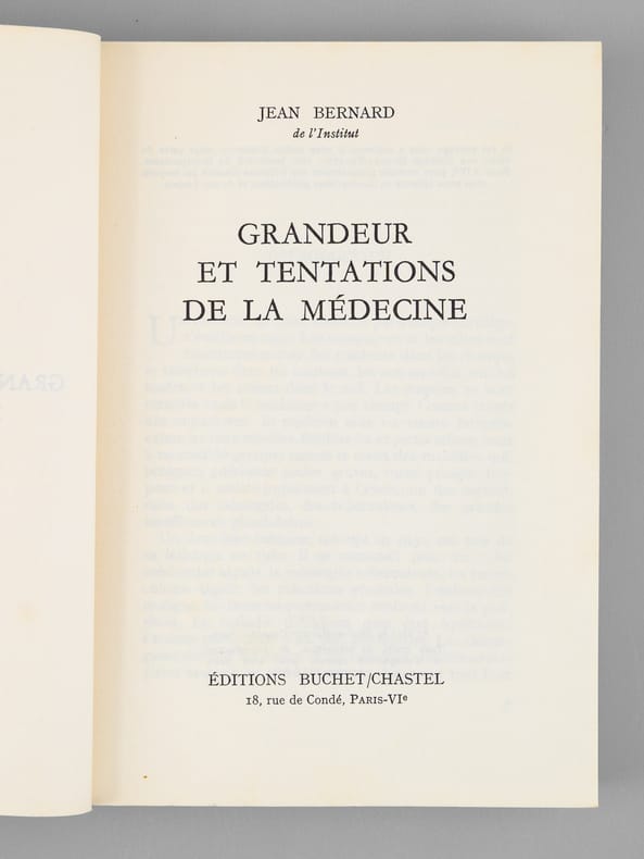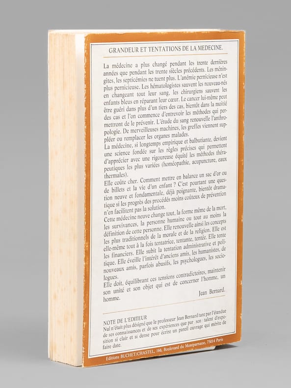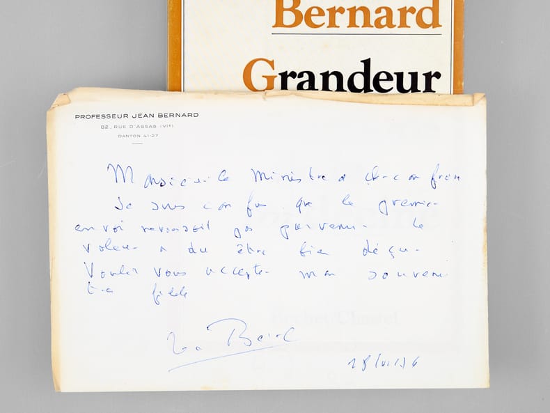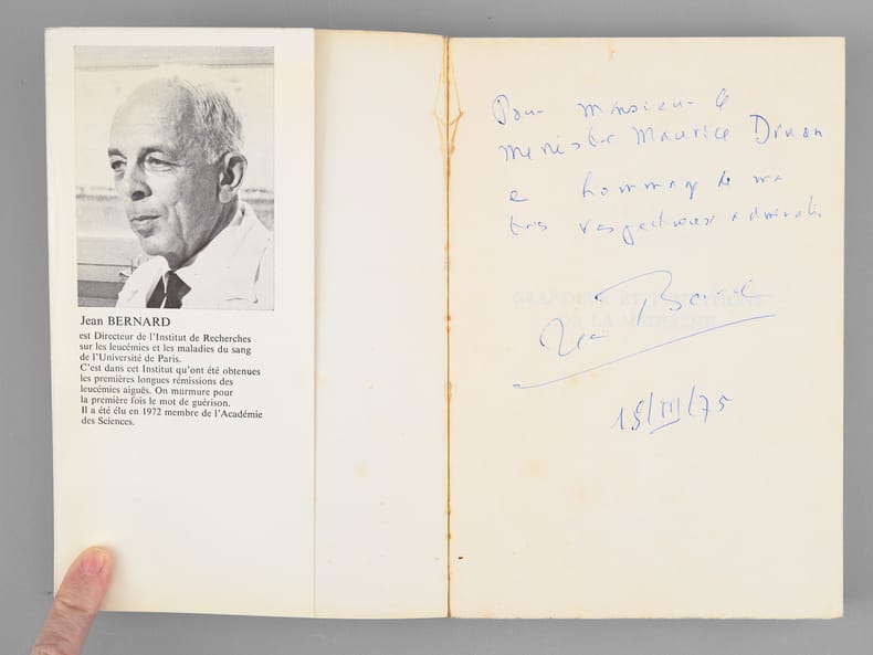 Envoi et billet de l'auteur à Maurice Druon : "Pour Monsieur le Ministre Maurice Druon, en hommage de ma très respectueuse admiration". Dans le billet joint, Jean Bernard ajoute : "Monsieur le Minisitre [..], Je suis confus que le premier envoi ne vous soit pas parvenu. Le voleur a dû être bien déçu. Voulez vous accepter mon souvenir très fidèle." L'auteur et le dédicataire furent tous deux académiciens. Maurice Druon (1918-2009), auteur notamment de la célèbre saga historique des Rois maudits, fut élu à l'Académie Française en 1968. Il en devint le Secrétaire Perpétuel, de 1985 à 1999. L'auteur, quant à lui, fut élu à l'Académie Française en 1975, au fauteuil de Marcel Pagnol. Le professeur Jean Bernard, éminent hématologue et oncologue, présida le Comité National d'Ethique de 1983 à 1993. Etat très satisfaisant (lég. rousseurs sur tr., bon état par ailleurs) pour cette exemplaire d'une origine prestigieuse.