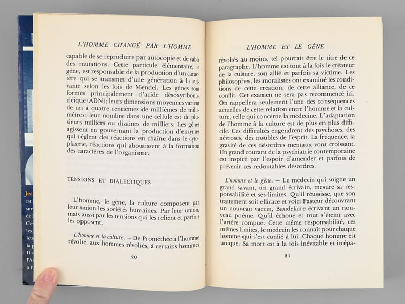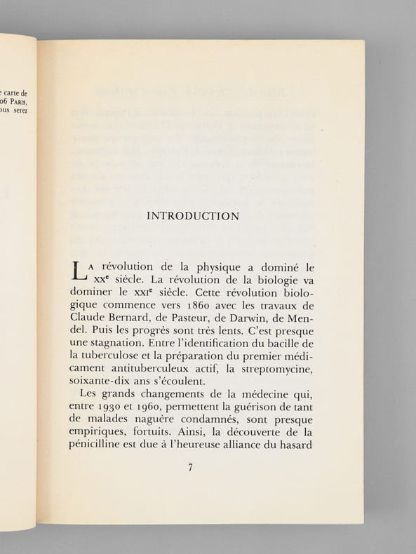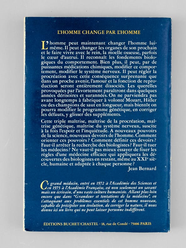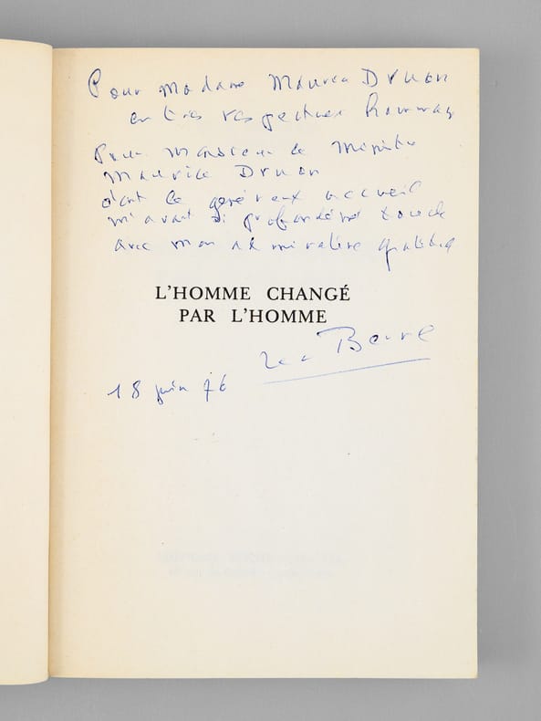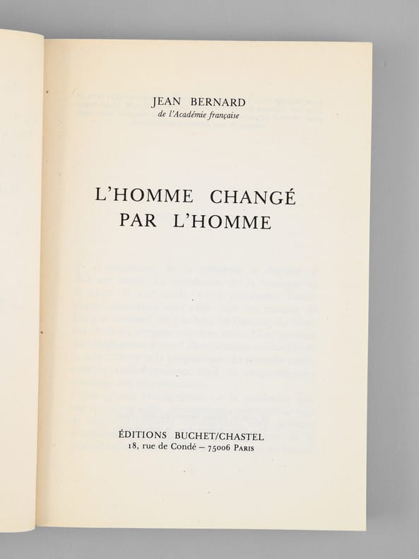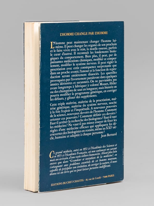 Envoi de l'auteur à Maurice Druon et à son épouse: "Pour Madame Maurice Druon, en très respectueux hommages pour monsieur le Ministre, Maurice Druon, dont le généreux accueil m'avait profondément touché. Avec mon admirative gratitude. Jean Bernard". L'auteur et le dédicataire étaient tous deux académiciens. Maurice Druon (1918-2009), auteur notamment de la célèbre saga historique des Rois maudits, fut élu à l'Académie Française en 1968. Il en devint le Secrétaire Perpétuel, de 1985 à 1999. L'auteur, quant à lui, venait d'être élu à l'Académie Française, en 1975, au fauteuil de Marcel Pagnol. Le professeur Jean Bernard, éminent hématologue et oncologue, présida le Comité National d'Ethique de 1983 à 1993. Etat très satisfaisant (lég. rouss. sur tranches, bon état par ailleurs) pour cette exemplaire d'une origine prestigieuse.