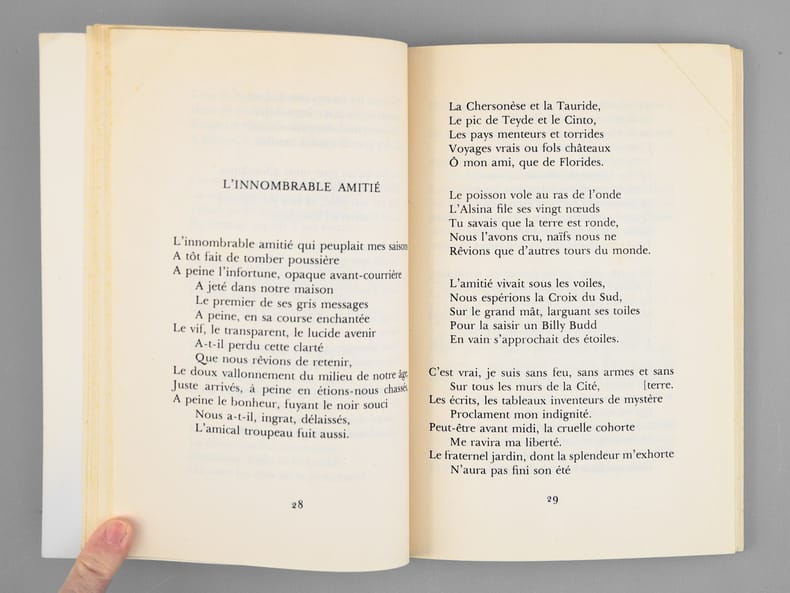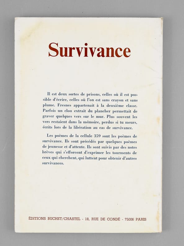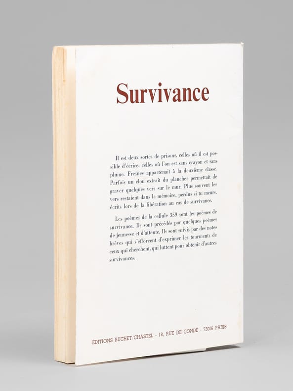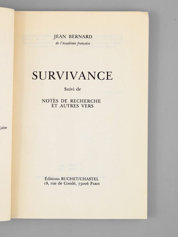 Envoi de l'auteur à Maurice Druon : "Pour Monsieur le Ministre Maurice Druon, ces vers de prison réédités en hommage d'admiration et d'amitié.". L'auteur et le dédicataire étaient tous deux académiciens. Maurice Druon (1918-2009), auteur notamment de la célèbre saga historique des Rois maudits, fut élu à l'Académie Française en 1968. Il en devint le Secrétaire Perpétuel, de 1985 à 1999. L'auteur, quant à lui, fut élu à l'Académie Française en 1975, au fauteuil de Marcel Pagnol. Le professeur Jean Bernard, éminent hématologue et oncologue, présida le Comité National d'Ethique de 1983 à 1993. Etat très satisfaisant (lég. rouss. sur tranche sup. , quelques pages écornées à titre de marque-pages par Maurice Druon, bon état par ailleurs) pour ce recueil de poèmes écrits en prison sous l'Occupation, dédicacé au co-auteur des paroles du Chant des Partisans.