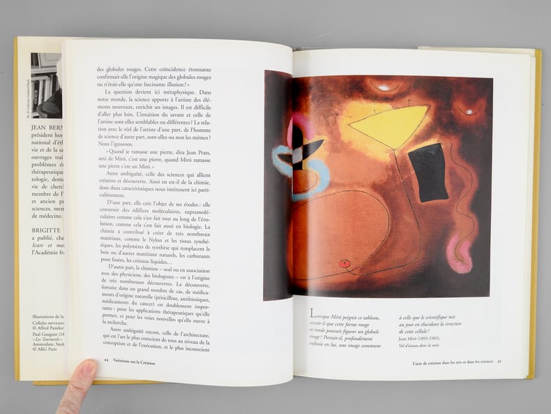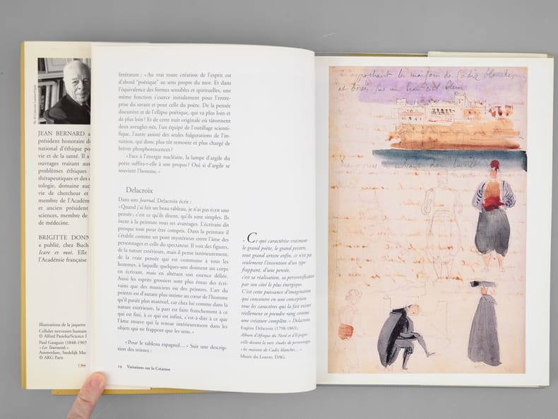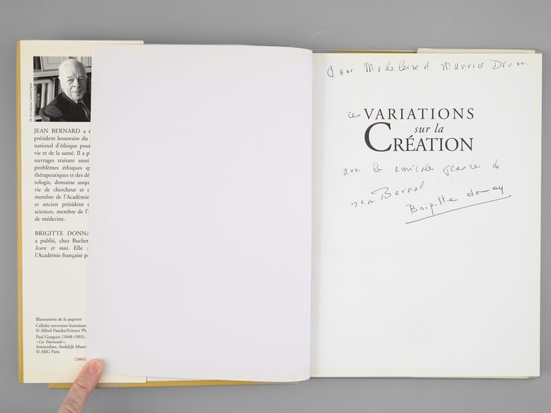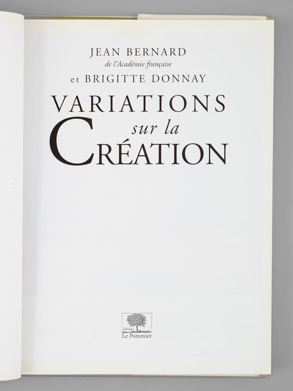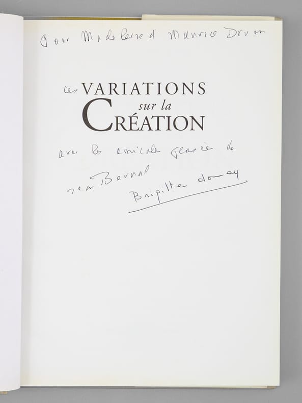 Envoi des auteurs à Maurice Druon et à son épouse: "Pour Madeleine et Maurice Druon, ces variations sur la Création, avec les amicales pensées de Jean Bernard, Brigitte Donnay". Jean Bernard et Maurice Druon étaient tous deux académiciens. Maurice Druon (1918-2009), auteur notamment de la célèbre saga historique des Rois maudits, fut élu à l'Académie Française en 1968. Il en devint le Secrétaire Perpétuel, de 1985 à 1999. L'auteur, quant à lui, fut élu à l'Académie Française en 1975, au fauteuil de Marcel Pagnol. Le professeur Jean Bernard, éminent hématologue et oncologue, présida le Comité National d'Ethique de 1983 à 1993. Bon état pour cet exemplaire d'une origine prestigieuse.