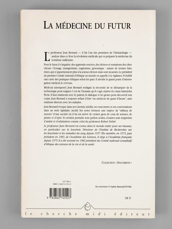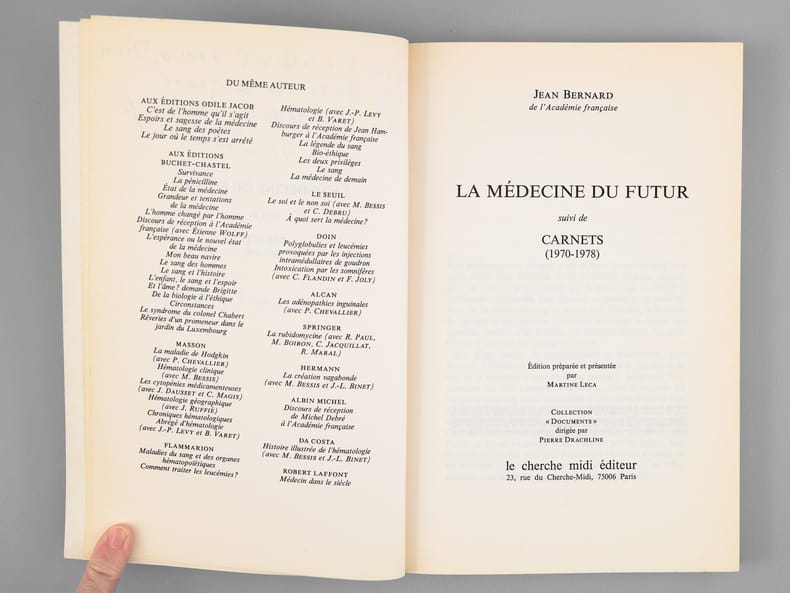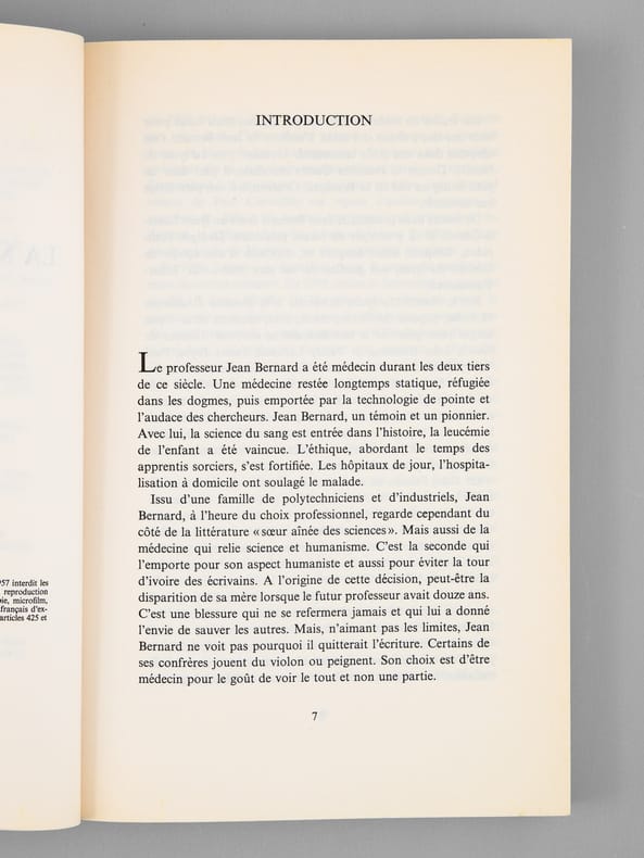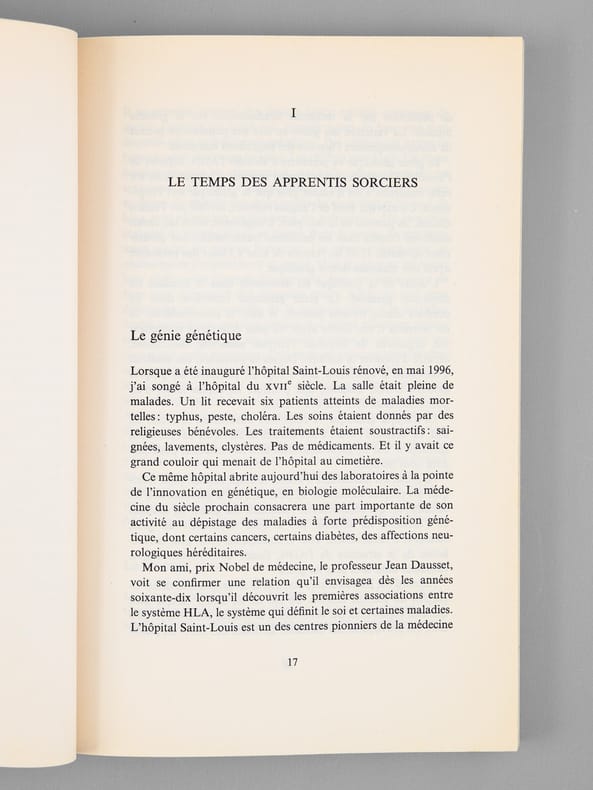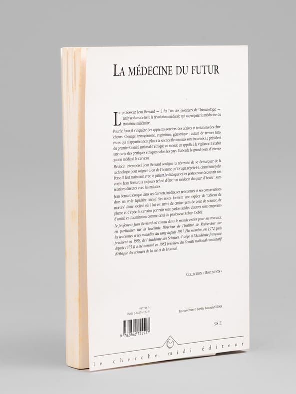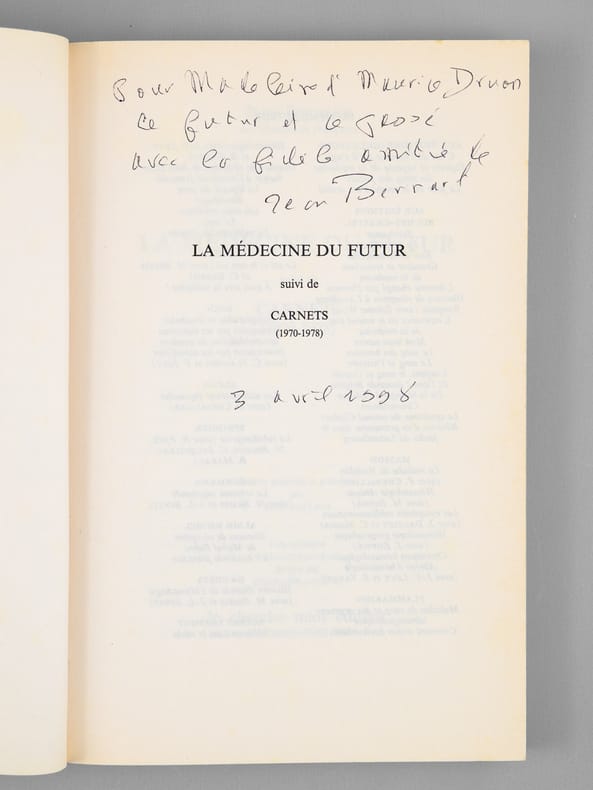 Envoi de l'auteur à Maurice Druon et à son épouse: "Pour Madeleine et Maurice Druon, ce futur et ce passé. Avec la fidèle amitiés de Jean Bernard". L'auteur et le dédicataire étaient tous deux académiciens. Maurice Druon (1918-2009), auteur notamment de la célèbre saga historique des Rois maudits, fut élu à l'Académie Française en 1968. Il en devint le Secrétaire Perpétuel, de 1985 à 1999. L'auteur, quant à lui, fut élu à l'Académie Française en 1975, au fauteuil de Marcel Pagnol. Le professeur Jean Bernard, éminent hématologue et oncologue, présida le Comité National d'Ethique de 1983 à 1993. Etat très satisfaisant (lég. rouss. sur tranches, quelques pages écornées à titre de marque-pages par Maurice Druon, bon état par ailleurs) pour cet exemplaire provenant d'une origine prestigieuse.