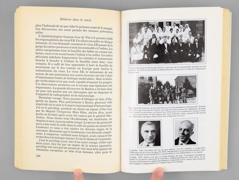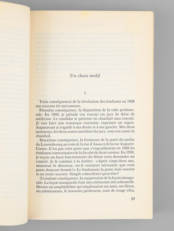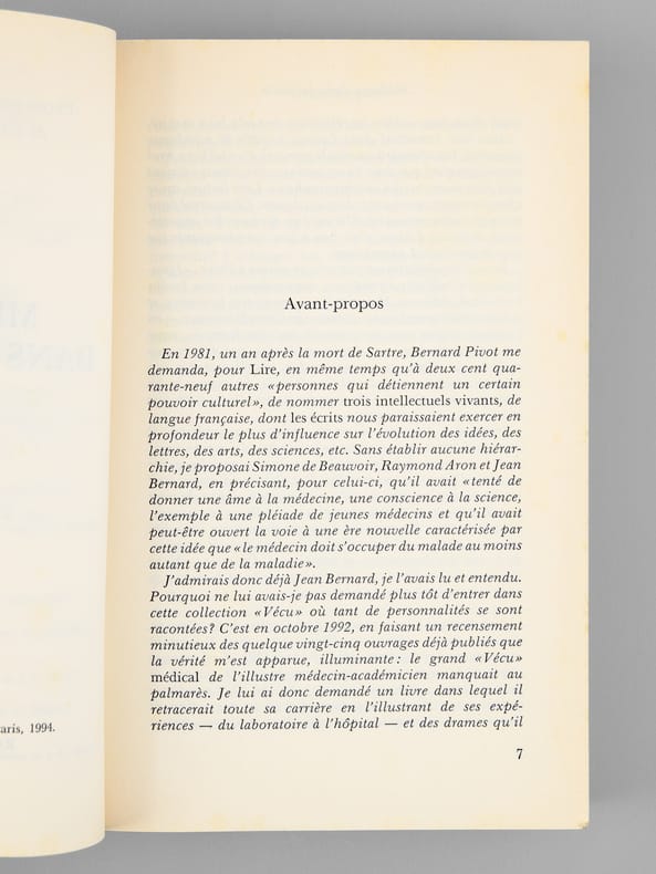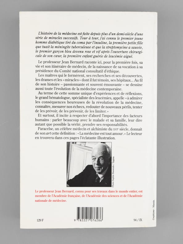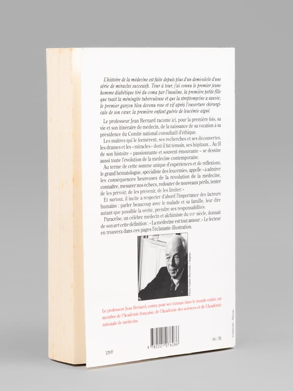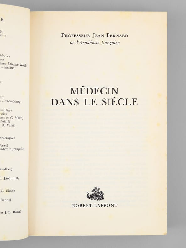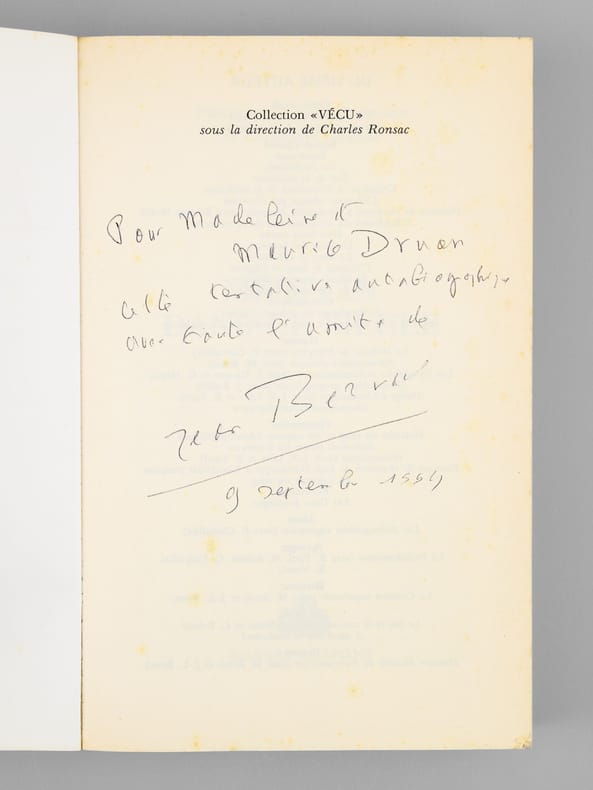 Envoi de l'auteur à Maurice Druon et à son épouse: "Pour Madeleine et Maurice Druon, cette tentative autobiographique. Avec toute l'amitié de Jean Bernard". L'auteur et le dédicataire étaient tous deux académiciens. Maurice Druon (1918-2009), auteur notamment de la célèbre saga historique des Rois maudits, fut élu à l'Académie Française en 1968. Il en devint le Secrétaire Perpétuel, de 1985 à 1999. L'auteur, quant à lui, fut élu à l'Académie Française en 1975, au fauteuil de Marcel Pagnol. Le professeur Jean Bernard, éminent hématologue et oncologue, présida le Comité National d'Ethique de 1983 à 1993. Etat très satisfaisant (lég. rouss. sur tranches, bon état par ailleurs) pour cet exemplaire d'une origine prestigieuse.