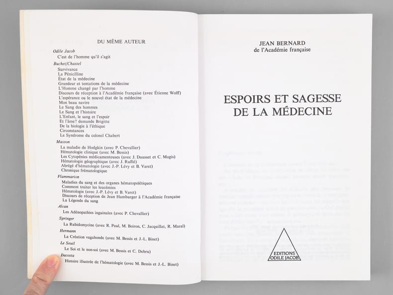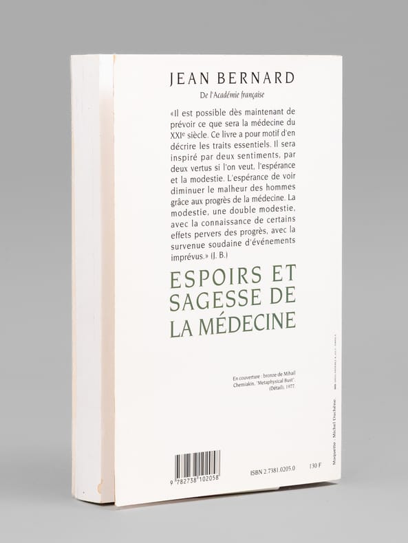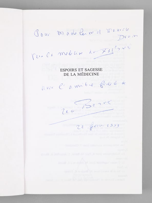 Envoi de l'auteur à Maurice Druon et à son épouse: "Pour Madeleine et Maurice Druon, vers la médecine du XXIe siècle, avec l'amitié fidèle de Jean Bernard". L'auteur et le dédicataire étaient tous deux académiciens. Maurice Druon (1918-2009), auteur notamment de la célèbre saga historique des Rois maudits, fut élu à l'Académie Française en 1968. Il en devint le Secrétaire Perpétuel, de 1985 à 1999. L'auteur, quant à lui, fut élu à l'Académie Française en 1975, au fauteuil de Marcel Pagnol. Le professeur Jean Bernard, éminent hématologue et oncologue, présida le Comité National d'Ethique de 1983 à 1993. Etat très satisfaisant (couv. lég. frottées, bon état par ailleurs) pour cet exemplaire d'une origine prestigieuse.