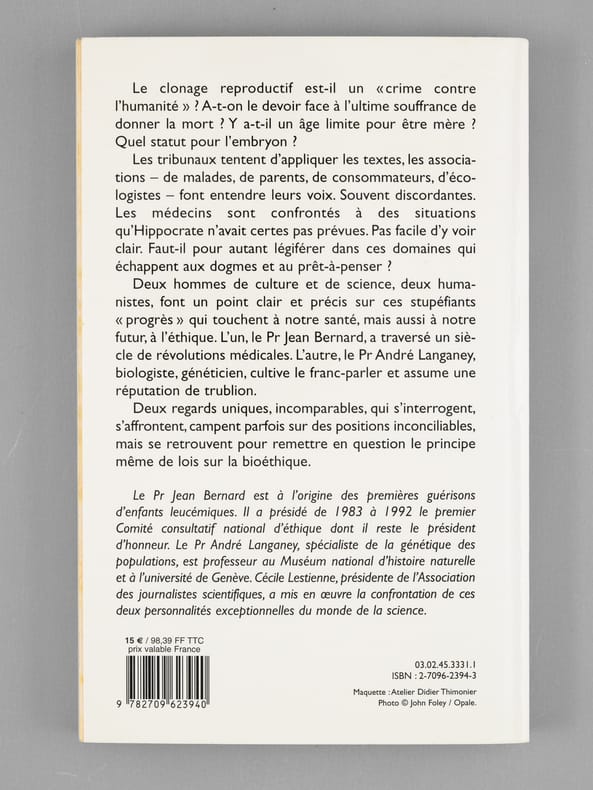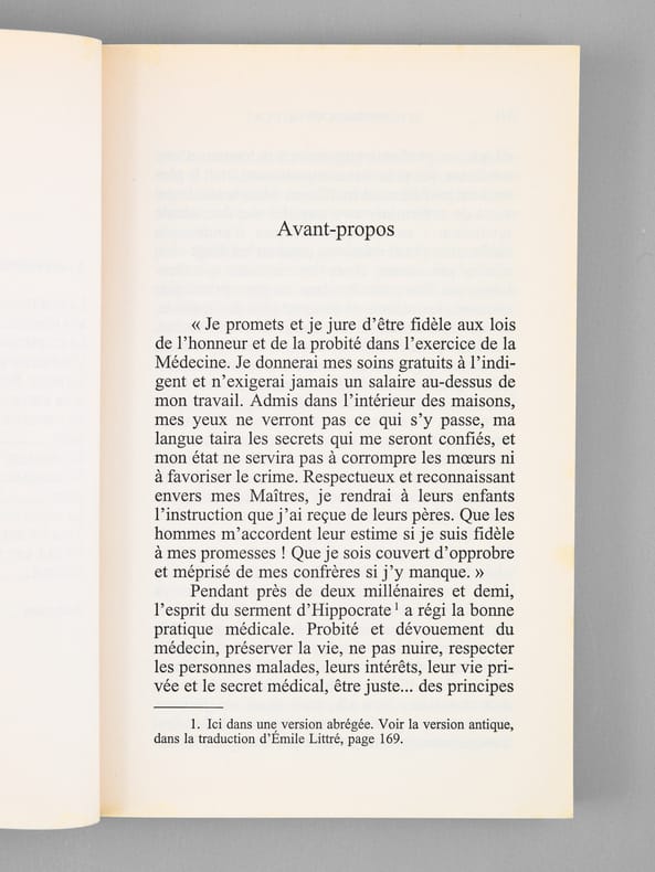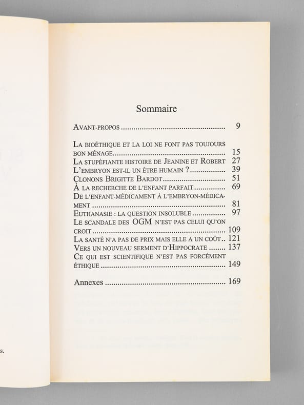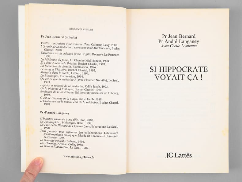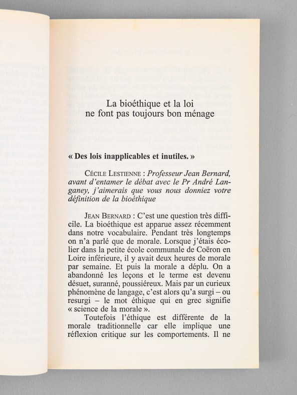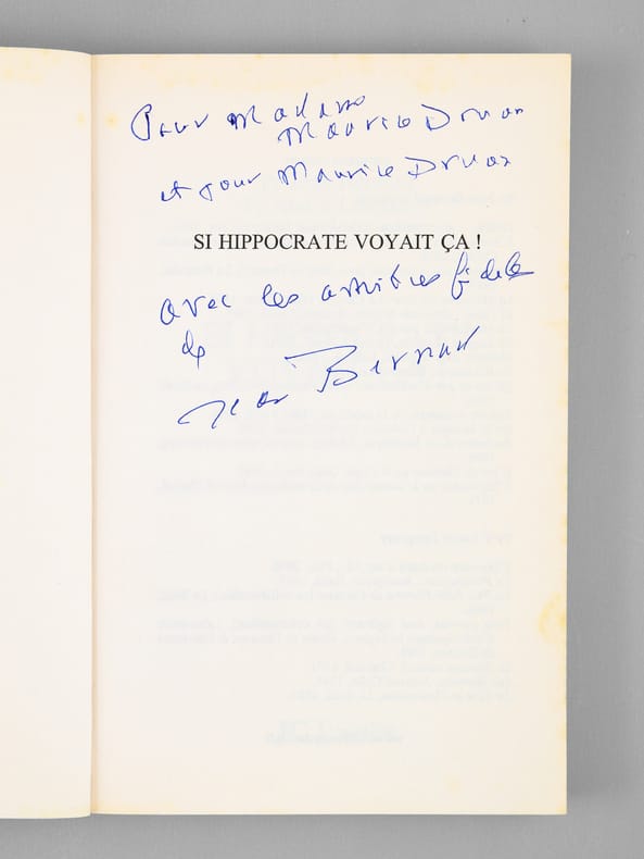 Envoi de l'auteur à Maurice Druon et à son épouse: "Pour Madame Maurice Druon et pour Maurice Druon, avec les amitiés fidèles de Jean Bernard". L'auteur et le dédicataire étaient tous deux académiciens. Maurice Druon (1918-2009), auteur notamment de la célèbre saga historique des Rois maudits, fut élu à l'Académie Française en 1968. Il en devint le Secrétaire Perpétuel, de 1985 à 1999. L'auteur, quant à lui, fut élu à l'Académie Française en 1975, au fauteuil de Marcel Pagnol. Le professeur Jean Bernard, éminent hématologue et oncologue, présida le Comité National d'Ethique de 1983 à 1993. Etat très satisfaisant (lég. rouss. sur tr., bon état par ailleurs) pour cet exemplaire d'une origine prestigieuse.