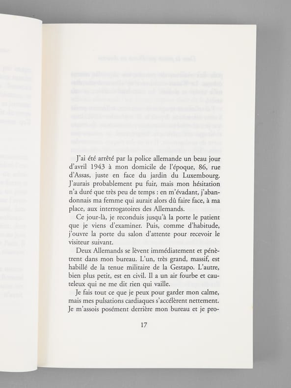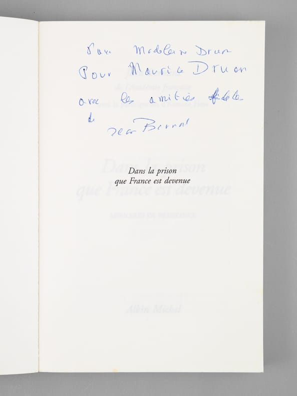 Envoi de l'auteur à Maurice Druon et à son épouse: "Pour Madeleine Druon, pour Maurice Druon, avec les amitiés fidèles de Jean Bernard". L'auteur et le dédicataire étaient tous deux académiciens. Maurice Druon (1918-2009), auteur notamment de la célèbre saga historique des Rois maudits, fut élu à l'Académie Française en 1968. Il en devint le Secrétaire Perpétuel, de 1985 à 1999. L'auteur, quant à lui, fut élu à l'Académie Française en 1975, au fauteuil de Marcel Pagnol. Le professeur Jean Bernard, éminent hématologue et oncologue, présida le Comité National d'Ethique de 1983 à 1993. Etat très satisfaisant (lég. rouss. sur tr. sup., bon état par ailleurs) pour ces souvenirs du résistant Jean Bernard, dédicacés au co-auteur des paroles du Chant des partisans.