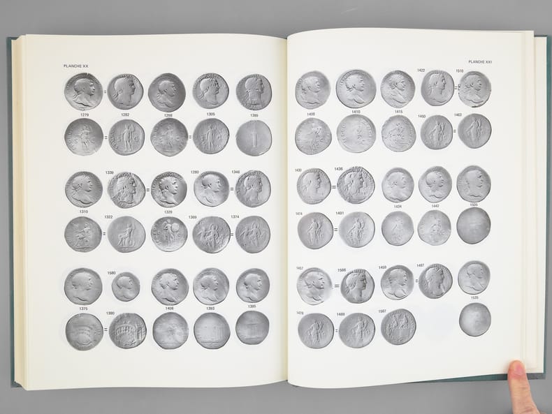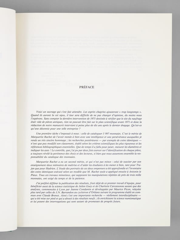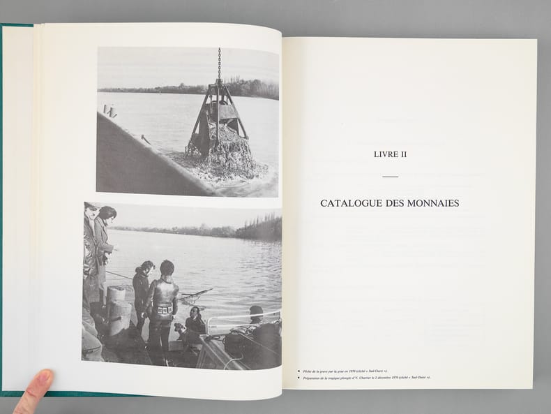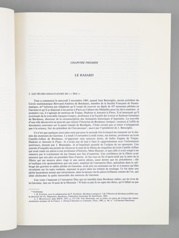 Belle étude scientifique de 3997 monnaies antiques trouvées en 1965 dans la Garonn, trésor d’un commerçant dont le bateau a coulé après avoir pris feu, en amont de Bordeaux, devant Quinsac. Bon état (sans la jaquette, très bon état par ailleurs)