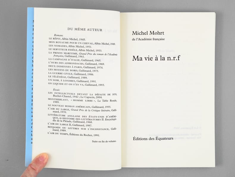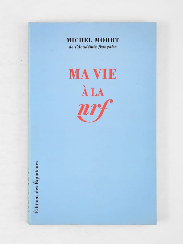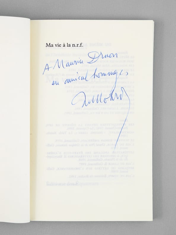 L'ouvrage, dédicacé à Maurice Druon, raconte la vie de Michel Mohrt à la NRF où, rentré en 1952, il fera publier de nombreux auteurs anglo-saxons tels Kerouac, Faulkner ou Philip Roth.. Romancier, écrivain et historien de la littérature, Michel Mohrt (1914-2011) fut élu en 1985 membre de l'Académie française au Fauteuil 33, le fauteuil de Voltaire, où il succède à Marcel Brion. Bon état (qq. rouss. sur tranche en tête).