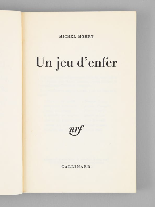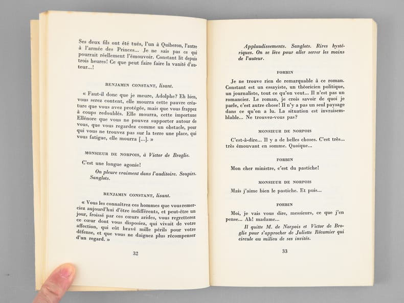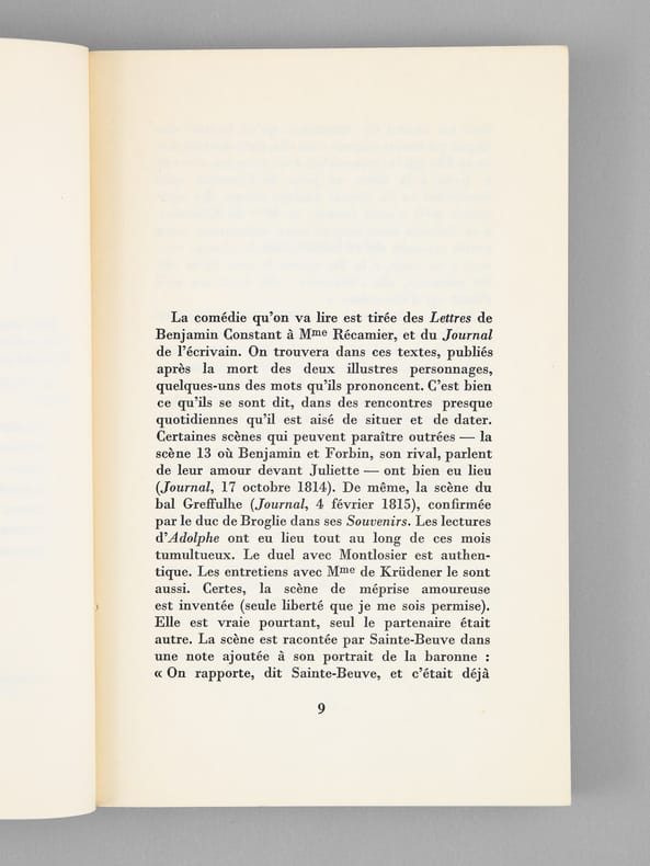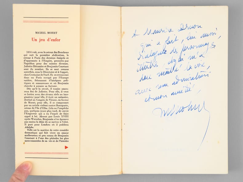 L'exemplaire est enrichi d'un bel envoi "à Maurice Druon, qui a fait, lui aussi, dialoguer des personnages illustres, et qui m'a donc montré la voie, avec mon admiration et mon amitié". Romancier, écrivain et historien de la littérature, Michel Mohrt (1914-2011) fut élu en 1985 membre de l'Académie française au Fauteuil 33, le fauteuil de Voltaire, où il succède à Marcel Brion. Bon état (légères rouss. sur tranche en tête). Cette pièce de théâtre se déroule en 1814 lor de la Première Restauration, et met en présence Juliette Récamier, Benjamin Constant, Louis de Forbin, le Comte de Montlosier, Victor de Broglie et Madame de Catelan.